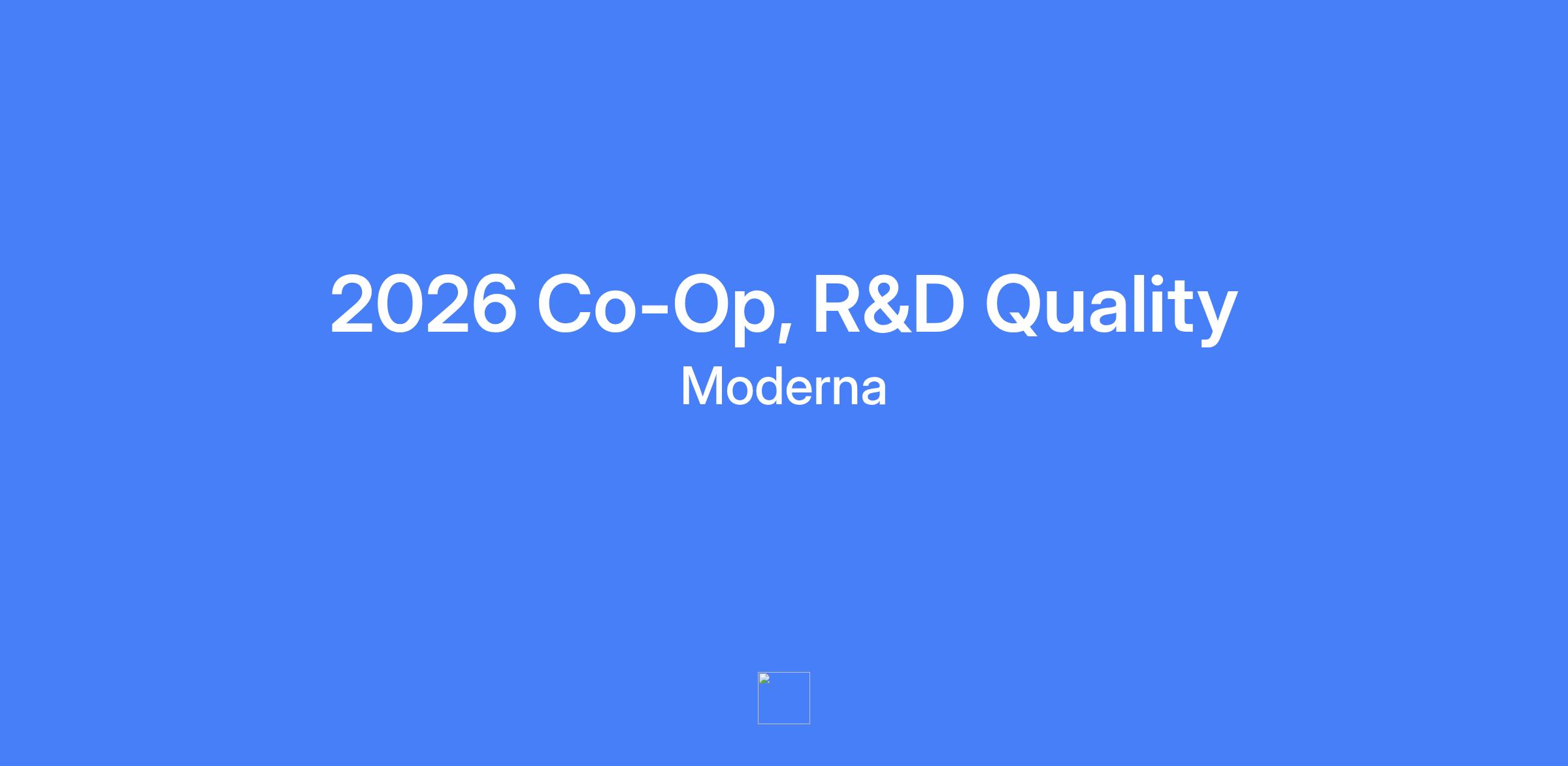 2026 Co-Op, R&D Quality. Moderna’s R&D Quality (RDQ) group seeks a motivated college student with an interest in Quality Assurance in a biotech/pharma RDQ environment. This role provides hands-on experience with RDQ GXPs (GCP/GLP/GVP/CSV) and contributes to key development projects to advance the program’s maturity. The co-op runs January 19 – June 26, 2026, on-site in Cambridge, MA for full-time duration.