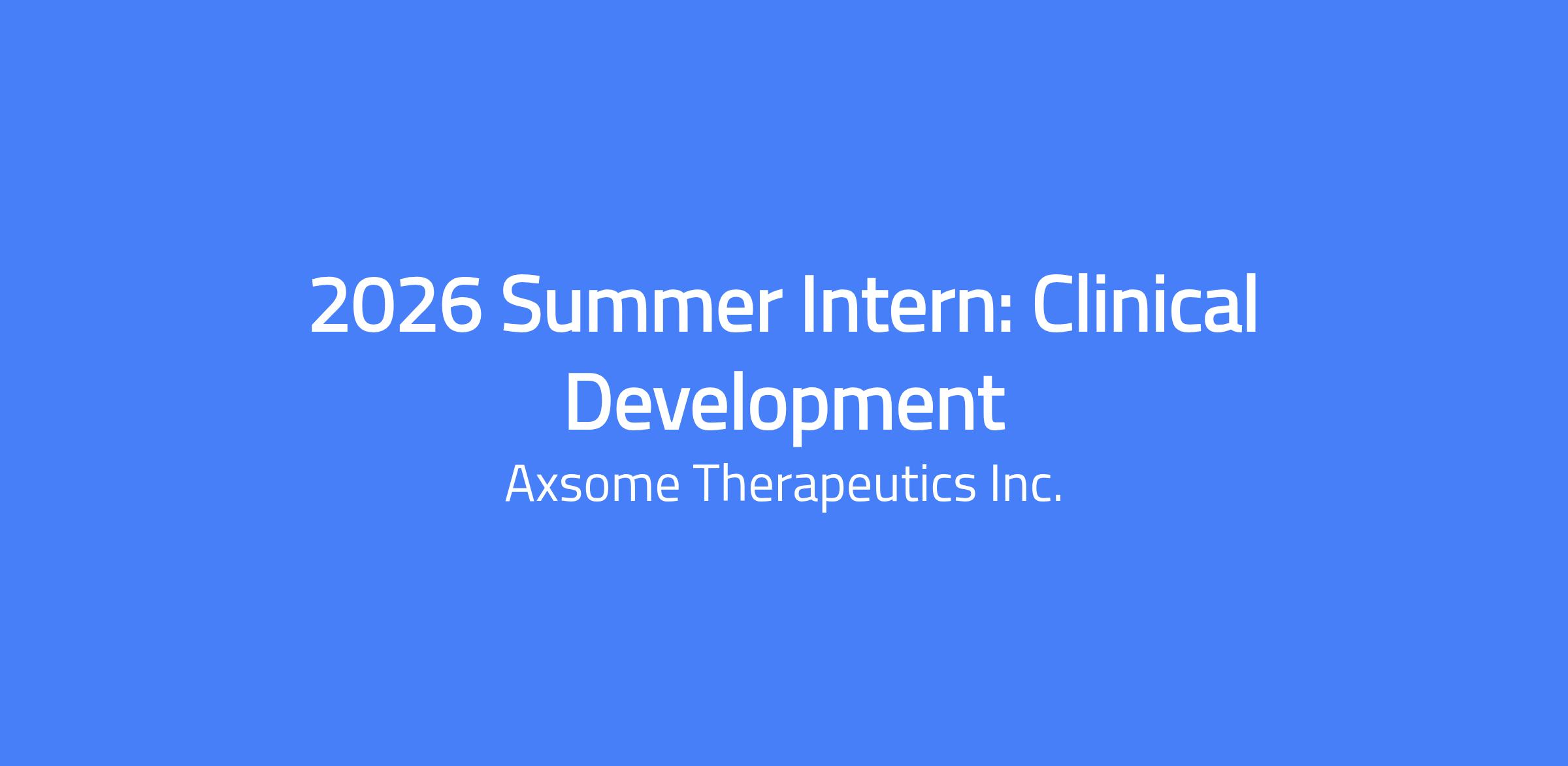 Axsome Therapeutics is seeking an intern to support the Clinical Development team. The Clinical Development team is responsible for leading the development of clinical programs for one or more product candidates within a specific therapeutic area. This individual will be responsible for assisting members of the Clinical Development team with a variety of day-to-day tasks, and ongoing projects.