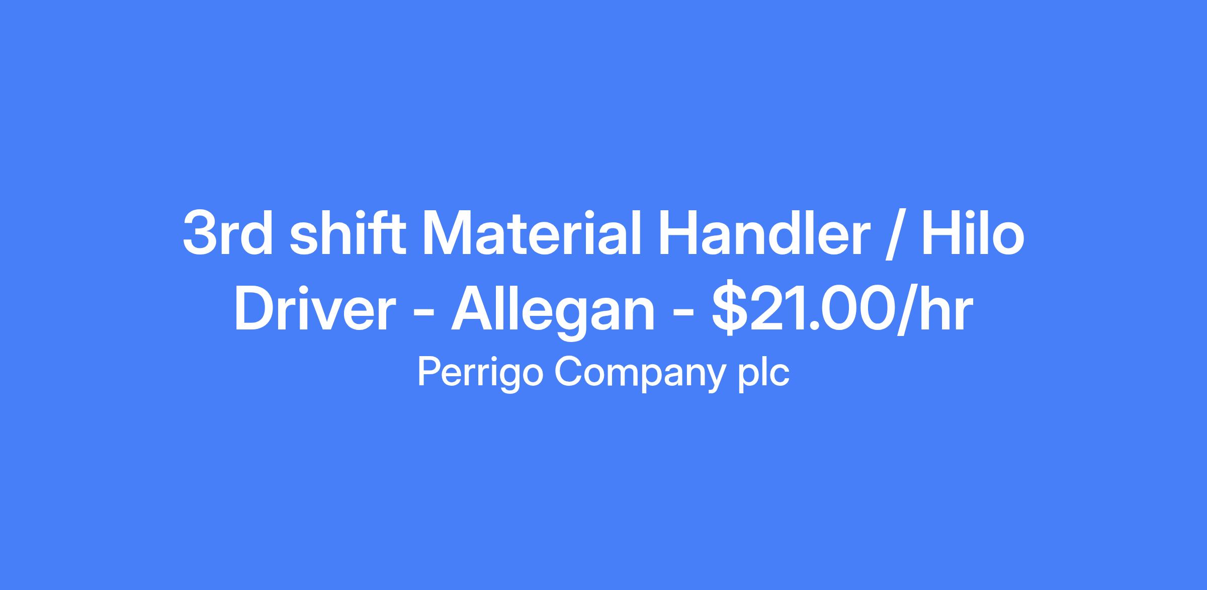 3rd shift Material Handler / Hilo Driver in Allegan, $21.00/hr. Responsibilities include receiving incoming product, picking customer orders, and loading trucks for shipment. Duties involve operating powered industrial equipment (forklifts, order pickers, dock trucks) and physical activity such as bending, lifting, and twisting.