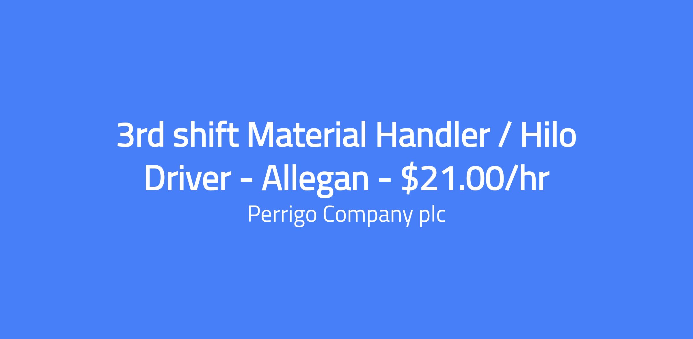 3rd shift Material Handler / Hilo Driver in Allegan, $21.00/hr. Responsibilities include receiving incoming product, picking customer orders, and loading trucks for shipment. Duties involve operating powered industrial equipment (forklifts, order pickers, dock trucks) and physical activity such as bending, lifting, and twisting.