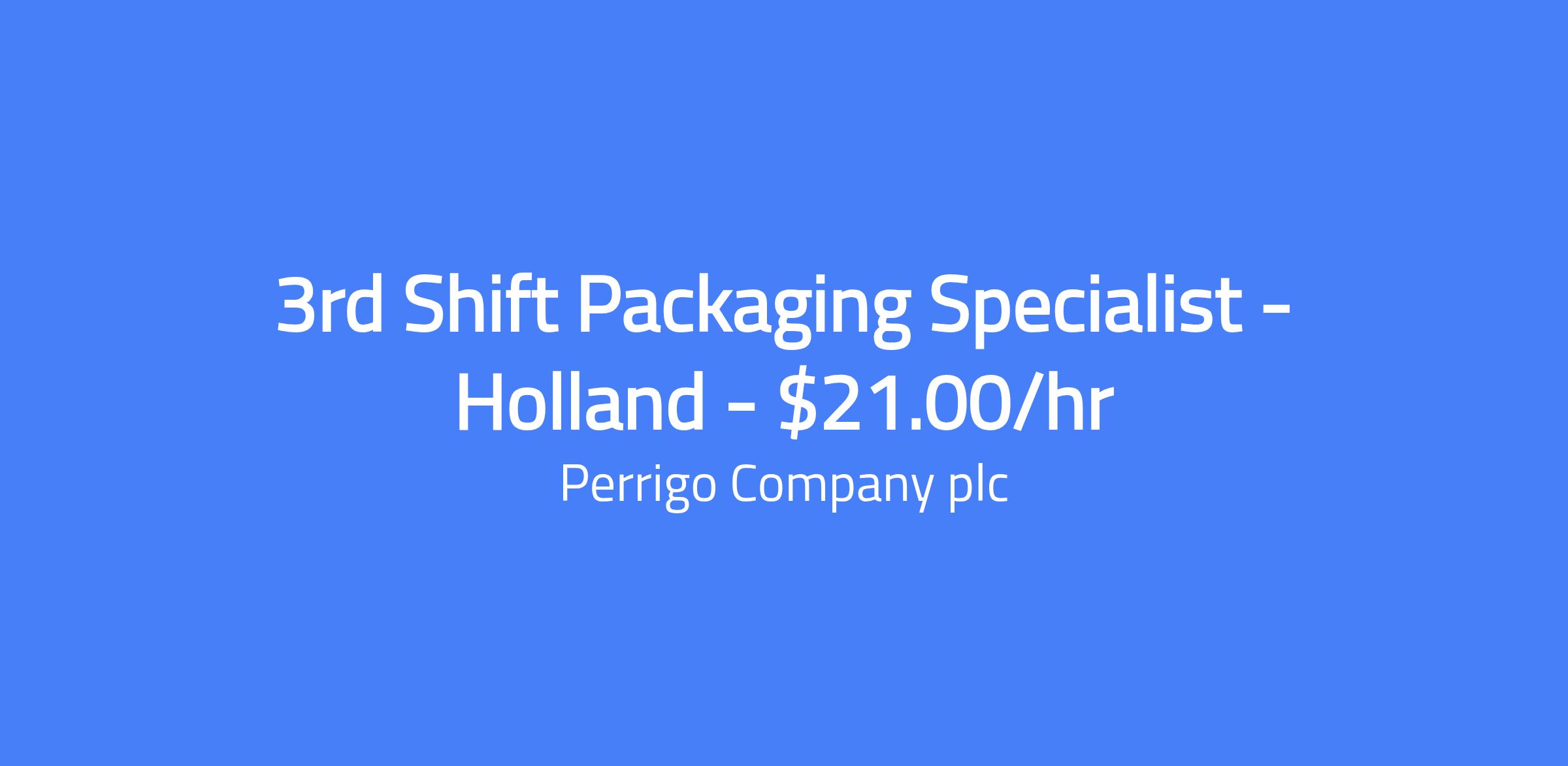 3rd Shift Packaging Specialist – Holland, $21.00/hr. Perrigo is hiring entry-level Packaging roles on 3rd shift. You will operate and support packaging operations for high-quality pharmaceutical products, adhering to current Good Manufacturing Practices, with emphasis on accuracy, safety, and cleanliness. The role requires independence, attention to detail, and the ability to follow established safety protocols.
