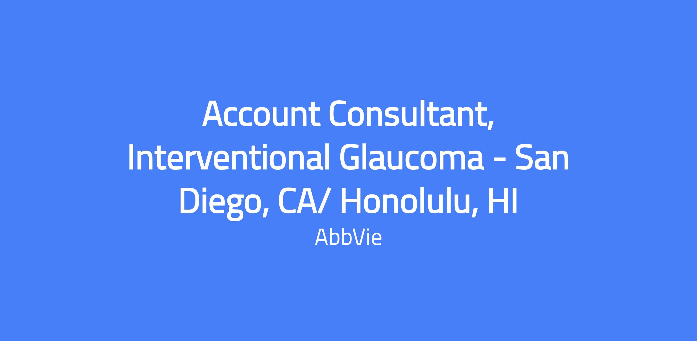 Account Consultant, Interventional Glaucoma – field-based role primarily covering San Diego, CA and Honolulu, HI. The position requires living within a reasonable distance of the primary city and involvement in field-based activities to promote AbbVie products, train healthcare professionals, and support hospital and health system accounts. Level will be commensurate with experience.