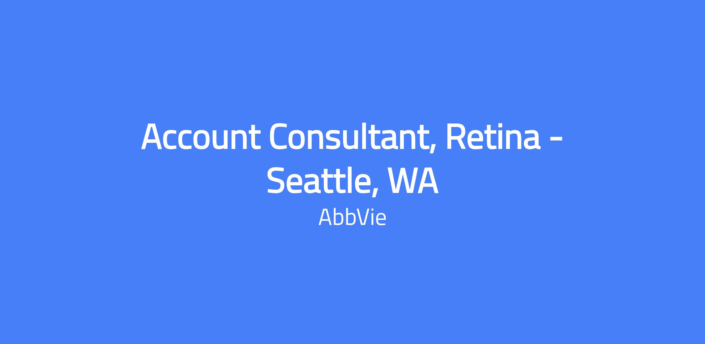 Location: Seattle, WA. The Account Consultant, Retina role is field-based and focuses on managing sales processes for AbbVie’s retinal therapies within assigned accounts. The position uses consultative and value-based selling, combined with comprehensive account management, to meet sales goals and support adoption of the product portfolio. It requires delivering technical product knowledge, training, and clinical education to customers, and effectively utilizing sales and data resources to drive growth. Travel within the territory is expected, with overnight trainings and meetings as needed.