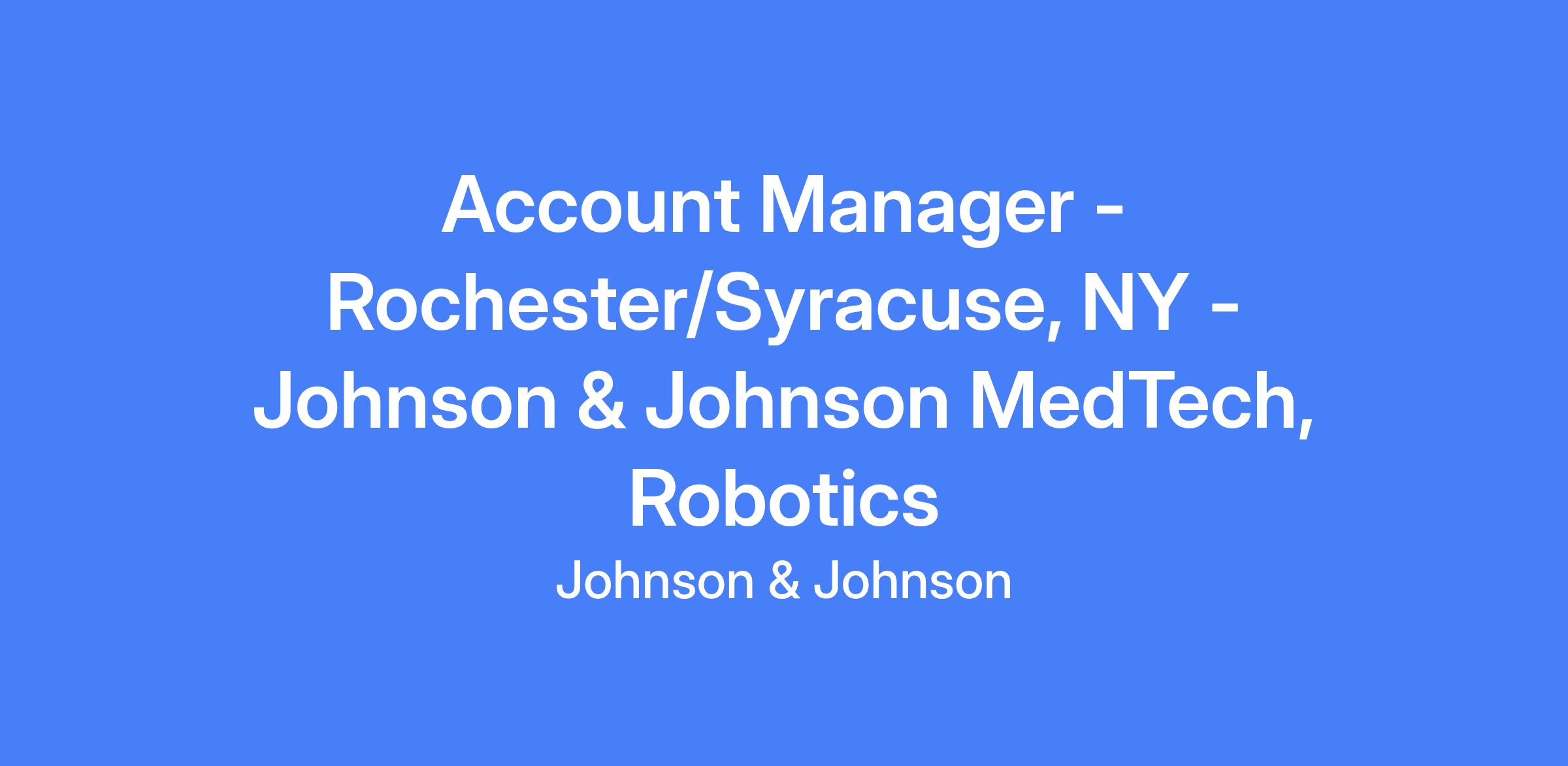 Account Manager in Rochester/Syracuse, NY for Johnson & Johnson MedTech, Robotics. Responsible for end-to-end program development, clinical success, procedure sales, and driving utilization of Auris Surgical Robotics Technologies, including post-sales adoption and physician education.