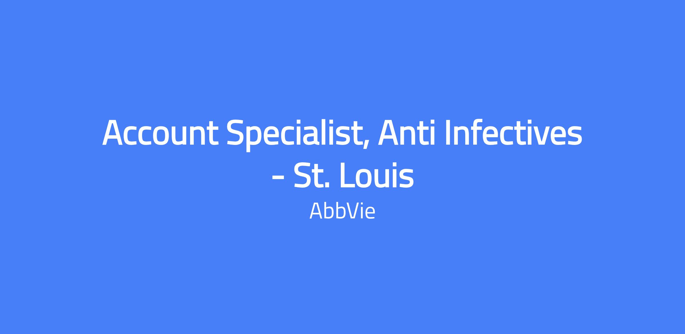 The Account Specialist, Anti Infectives, is field-based and responsible for maximizing opportunities for the product portfolio within a defined geography. This role develops and maintains strategic business relationships with Hospitals, IDNs, Academic Institutions, Outpatient Accounts, Long Term Care Facilities, Government Accounts, and Specialty Private Practice to increase patient access to portfolio products, expand current business, and achieve geography sales goals. The position covers St. Louis and the Western portion of Missouri and requires collaboration across cross-functional teams and external healthcare partners.