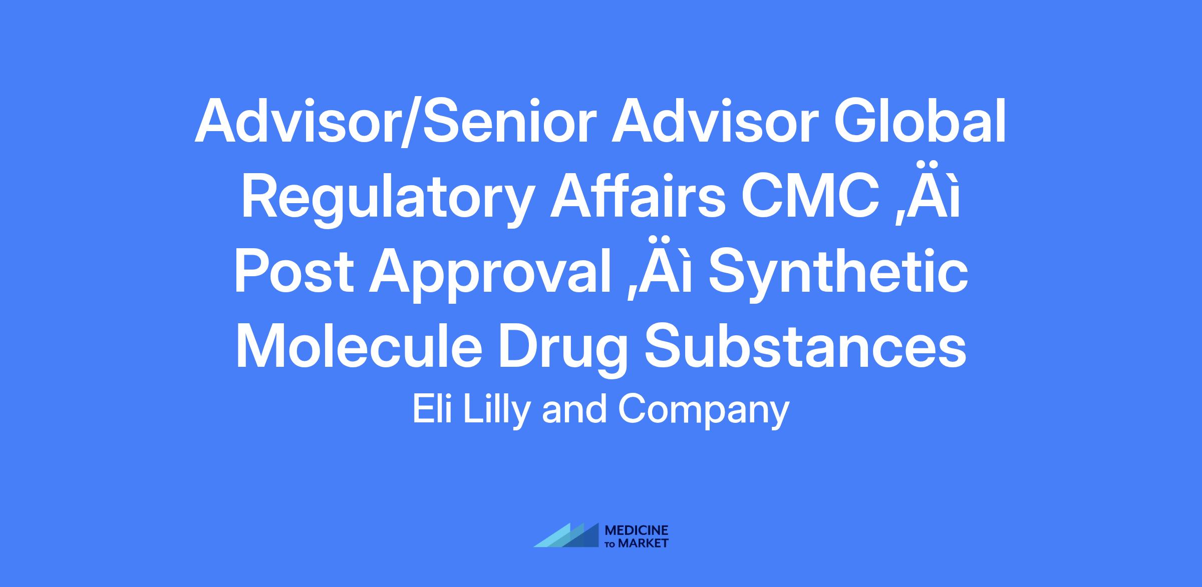 Advisor/Senior Advisor Global Regulatory Affairs CMC – Post Approval – Synthetic Molecule Drug Substances. Lilly is seeking post-approval regulatory CMC scientists to drive regulatory CMC strategies and lifecycle submissions for Lilly’s commercial products, leveraging CMC technical knowledge and regulatory science expertise to support product lifecycles.