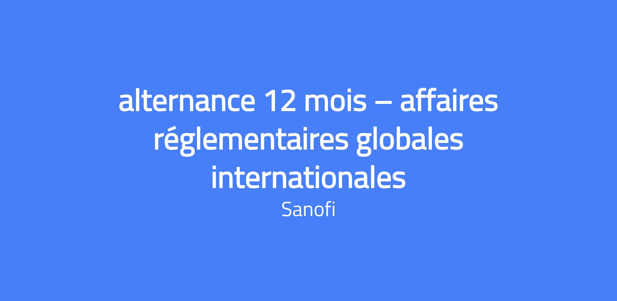 Intitulé du poste: alternance 12 mois â affaires réglementaires globales internationales Lieu : Gentilly A partir de : septembre 2026 à propos du poste En tant quâalternant.e au sein de lâéquipe Affaires Réglementaires Globales région Internationale, vous allez participer aux demandes dâautorisation de mise sur le marché des nouveaux produits pour les médicaments et vaccins. Prêt à commencer ? Prêt(e) à développer tes compétences tout en participant à lâavenir de la santé ? Chez Sanofi, tu auras la liberté dâapprendre, de poser des questions et de donner vie à tes idées, le tout soutenu par des mentors inspirants et des équipes collaboratives. à propos de Sanofi : Sanofi est une entreprise biopharmaceutique qui innove en R&D et exploite l'IA à grande échelle pour améliorer la vie des gens et créer de la croissance à long terme. Notre compréhension approfondie du système immunitaire â et notre pipeline innovant â nous permet dâinventer des médicaments et des vaccins qui traitent et protègent des millions de personnes dans le monde entier. Ensemble, nous poursuivons les miracles de la science pour améliorer la vie des gens. Principales responsabilités : Participer à lâélaboration de la stratégie réglementaire et à la préparation des dossiers dâenregistrement des nouveaux produits de Sanofi de la région internationale Contribuer à des projets transverses en support au responsable des équipes produits pharmaceutiques et vaccins Apporter votre support lors de formations auprès des collaborateurs sur les nouvelles réglementations Prendre part à la mise à jour des bases de données réglementaires à propos de vous Compétences techniques et relationnelles : rigueur, organisation, autonomie. Maitrise du pack Office. Expérience en affaires réglementaires Ãducation : bac+6 en pharmacie ou ingénierie avec une spécialisation en affaires réglementaires Langues : anglais courant Pourquoi nous choisir ? Lance ta carrière dans une entreprise qui investit en toi, et te donne les moyens de réinventer ce qui est possible. Construis ton avenir avec les outils les plus récents, lâinnovation digitale et un apprentissage continu pour toujours garder une longueur dâavance. Ãvolue dans une entreprise engagée où ta voix compte et où ton travail améliore la vie de millions de personnes. Ãpanouis-toi dans des environnements inclusifs et flexibles qui soutiennent ton bien-être personnel et professionnel. Profitez dâune rémunération attractive et lâaccès à un grand nombre dâavantages (Intéressement et participation, Plan Actionnariat Salarié, Activités sociales CSE) Bénéficiez de 31 jours de congés par an et jusquâà 5 jours d'absence "préparation examen" rémunérés, en fonction de votre contrat dâalternance (apprentissage, professionnalisation). Notre processus de recrutement a été pensé pour être rapide et efficace. Si votre candidature est retenue, vous recevrez un appel de notre recruteur.se pour un premier échange téléphonique puis pour rencontrer rapidement le ou la manager. Toujours Progresser. Découvrir lâExtraordinaire. Rejoignez Sanofi et entrez dans une nouvelle ère de la science â où votre parcours peut être aussi transformateur que le travail que nous accomplissons. Nous investissons en vous pour que vous alliez plus loin, accélériez votre réflexion et accomplissiez ce qui nâa jamais été fait auparavant. Vous contribuerez à repousser les limites, à bousculer les conventions et à concevoir des solutions plus intelligentes pour les communautés que nous servons. Prêt·e à poursuivre les miracles de la science et à améliorer la vie des gens ? Poursuivons le progrès et découvrons lâextraordinaire â ensemble. Chez Sanofi, nous croyons dans lâégalité des chances, sans distinction de race, de couleur, dâascendance, de religion, de sexe, dâorigine, dâorientation sexuelle, dââge, de citoyenneté, dâétat civil, de handicap, dâidentité de genre ou de tout autre critère protégé par la loi. Pursue progress, discover extraordinary Better is out there. Better medications, better outcomes, better science. But progress doesnât happen without people â people from different backgrounds, in different locations, doing different roles, all united by one thing: a desire to make miracles happen. So, letâs be those people. At Sanofi, we provide equal opportunities to all regardless of race, colour, ancestry, religion, sex, national origin, sexual orientation, age, citizenship, marital status, ability or gender identity. Watch our ALL IN video and check out our Diversity Equity and Inclusion actions at sanofi.com! Global Terms & Conditions and Data Privacy Statement Sanofi is dedicated to supporting people through their health challenges. We are a global biopharmaceutical company focused on human health. We prevent illness with vaccines, provide innovative treatments to fight pain and ease suffering. We stand by the few who suffer from rare diseases and the millions with long-term chronic conditions. With more than 100,000 people in 100 countries, Sanofi is transforming scientific innovation into healthcare solutions around the globe. Discover more about us visiting www.sanofi.com or via our movie We are Sanofi As an organization, we change the practice of medicine; reinvent the way we work; and enable people to be their best versions in career and life. We are constantly moving and growing, making sure our people grow with us. Our working environment helps us build a dynamic and inclusive workplace operating on trust and respect and allows employees to live the life they want to live. All in for Diversity, Equity and Inclusion at Sanofi - YouTube