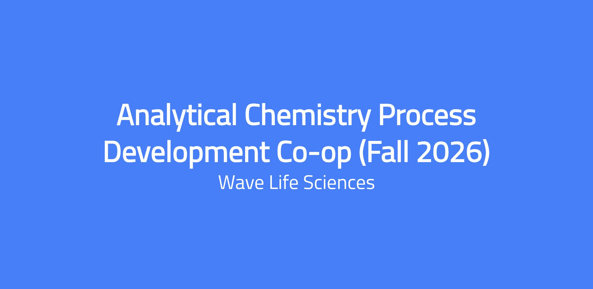 Analytical Chemistry Process Development Co-op (Fall 2026) – Wave Life Sciences seeks a highly motivated co-op to join its Process Development team in Lexington, Massachusetts. The role offers exposure to oligonucleotide synthesis, analytical methods, and formulations. You will be trained in a variety of laboratory techniques and instrumentation common to the pharmaceutical and biotech industry. This position is suitable for students, including those seeking their first co-op, and requires strong organizational skills, attention to detail, and the ability to thrive in a team-oriented, fast-paced environment. Analytical chemistry or biochemistry laboratory experience is preferred.