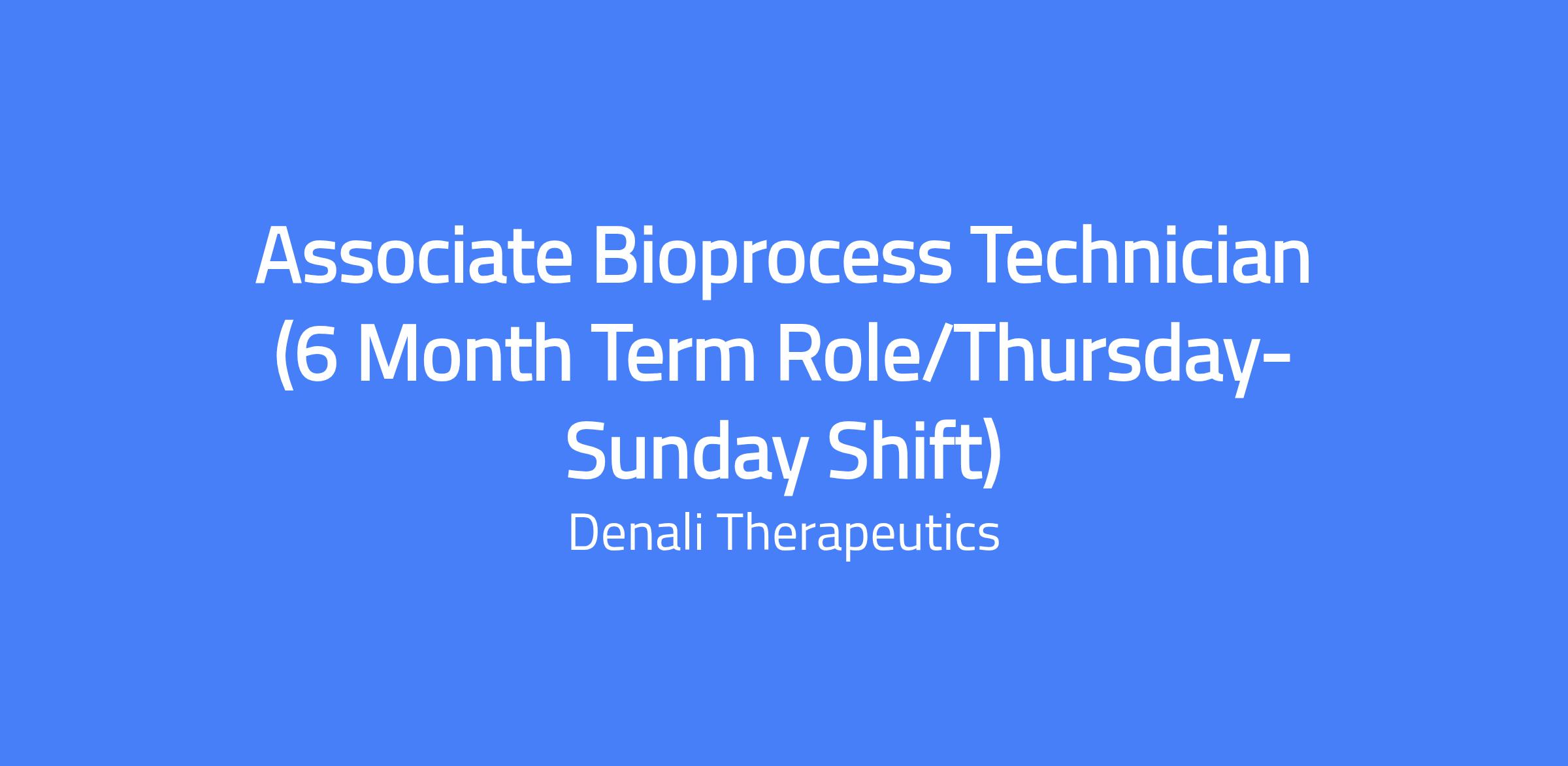 Associate Bioprocess Technician (6 Month Term Role/Thursday-Sunday Shift) at Denali Therapeutics. Responsible for media and buffer preparation and introduction to cell culture and purification processes as part of production campaigns. Work involves equipment setup/takedown, documentation, and collaboration across cross-functional teams to optimize manufacturing processes while adhering to GMP and company policies.