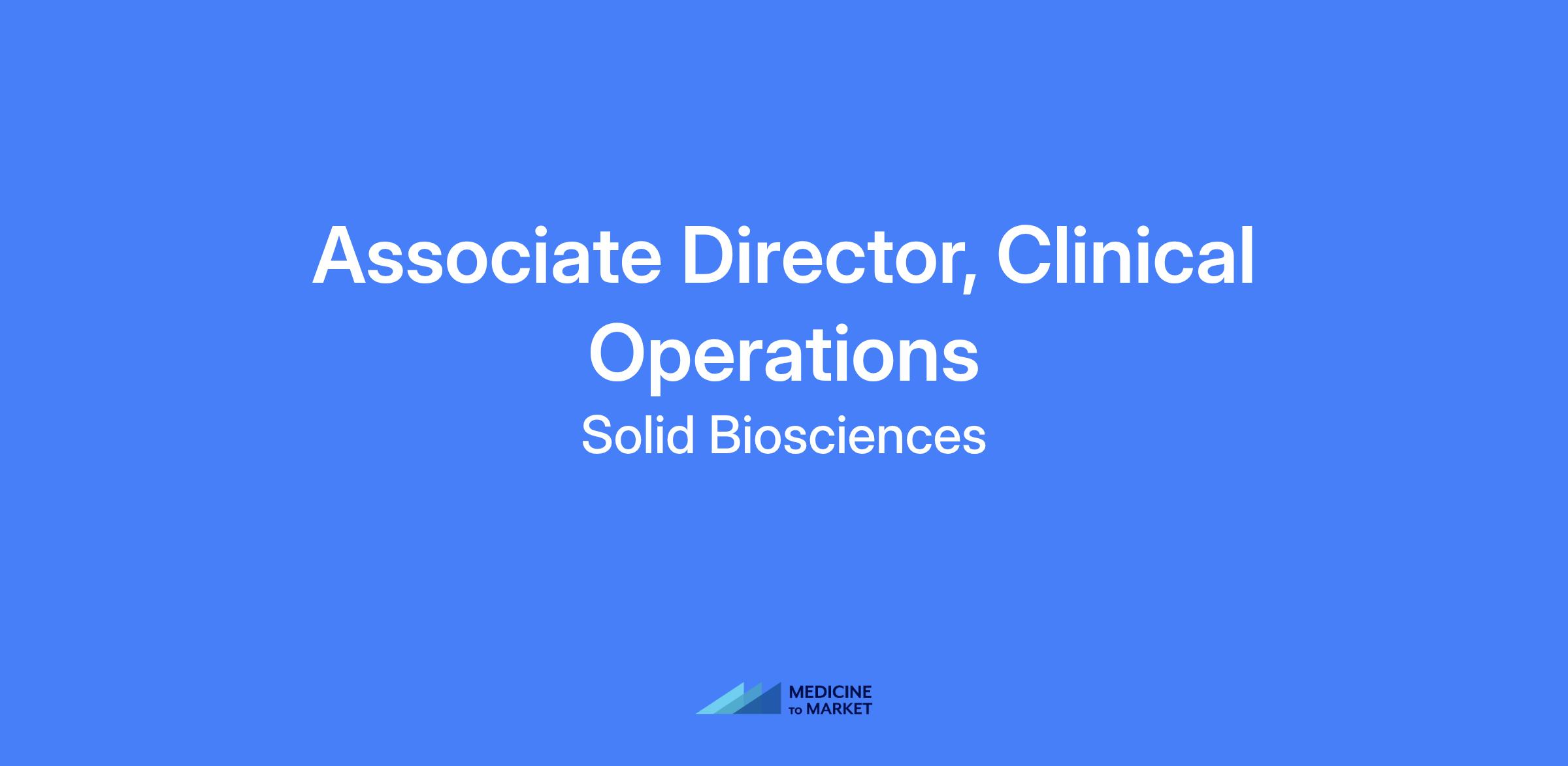Associate Director, Clinical Operations – Solid Biosciences. HQ Hybrid or Remote. Manage clinical trial activities for multiple trials, overseeing CROs, timelines, and budgets; collaborate with Clinical Development to develop protocols; lead internal study teams and outsourced activities; interact with investigators and site staff; report to the Senior Director, Clinical Operations. Based in Charlestown, MA or remote.
