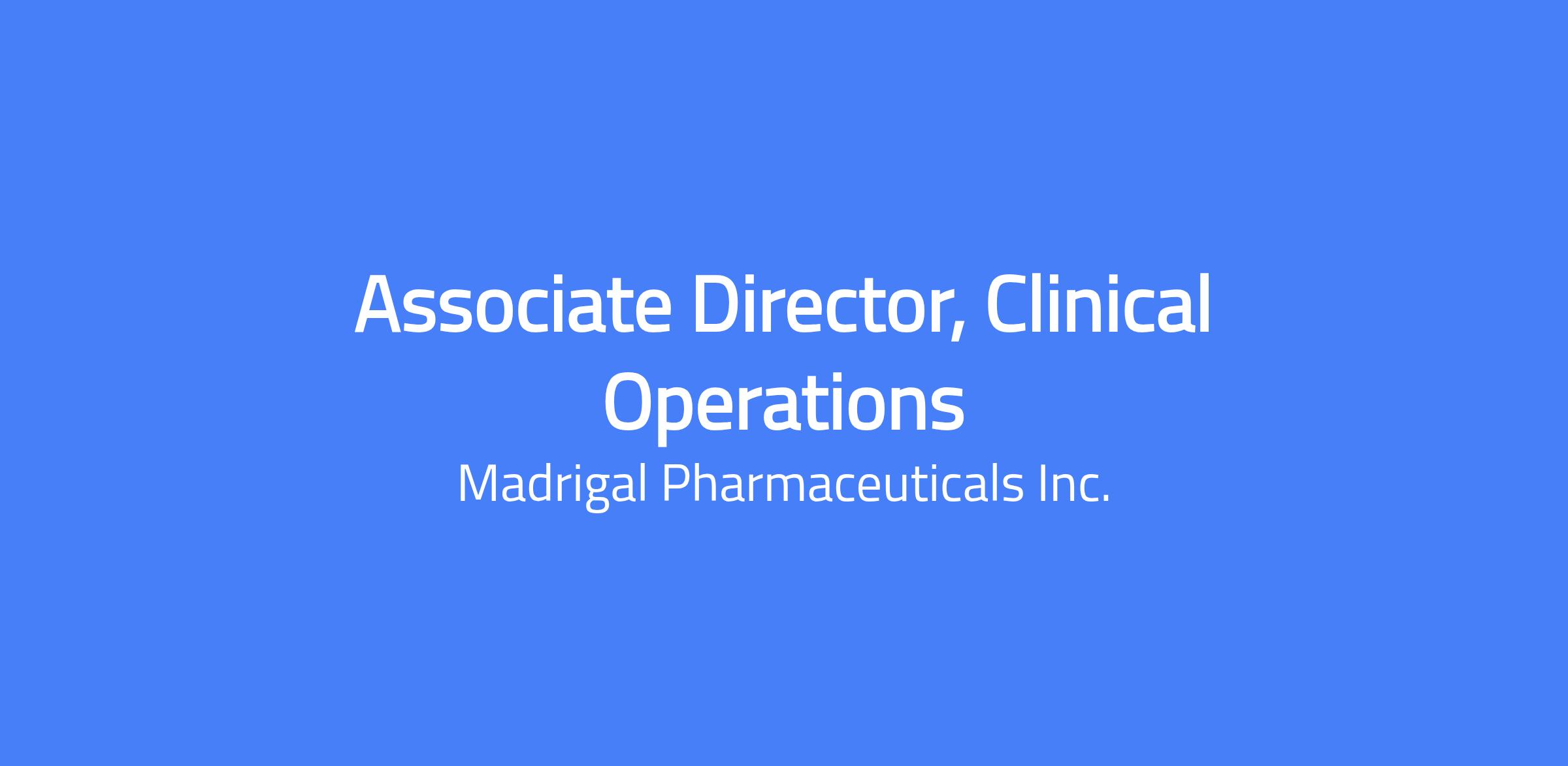 Madrigal is a biopharmaceutical company focused on delivering novel therapeutics for metabolic dysfunction-associated steatohepatitis (MASH), a serious liver disease that can progress to cirrhosis, liver failure, need for liver transplantation and premature mortality. Every member of our Madrigal team is connected by our shared purpose: leading the fight against MASH. Madrigal芒聙聶s medication, Rezdiffra (resmetirom), is a once-daily, oral, liver-directed THR-脦虏 agonist designed to target key underlying causes of MASH. Rezdiffra is the first and only medication approved by both the FDA and European Commission for the treatment of MASH with moderate to advanced fibrosis (F2 to F3). An ongoing Phase 3 outcomes trial is evaluating Rezdiffra for the treatment of compensated MASH cirrhosis (F4c). Our success is driven by our people. We are building a dynamic, inclusive, and high-performing culture that values scientific excellence, operational rigor, and collaboration. To support our continued growth, we are strengthening our workforce strategy to ensure we have the right talent, at the right time, in the right way. The Associate Director of Clinical Operations supports the operational planning, execution, and oversight of Phase I芒聙聯IV clinical trials. This role is responsible for day-to-day operational management of assigned studies, with a strong focus on CRO and vendor oversight, timelines, budgets, and high-quality execution in compliance with global regulatory requirements. Working closely with the Director and cross-functional partners, the Associate Director contributes to trial strategy, proactively manages risks, and ensures delivery against program and corporate objectives. The ideal candidate is a hands-on clinical operations professional who thrives in a fast-paced, growing biotech environment. Key Responsibilities 脗路 Support and manage the operational execution of Phase I芒聙聯IV clinical trials. 脗路 Oversee day-to-day trial activities including startup, conduct, close-out, and inspection readiness for assigned studies. 脗路 Proactively assess, manage, and communicate operational risks and issues related to clinical trial delivery. 脗路 Ensure trials are conducted in compliance with ICH-GCP, FDA, EMA, and applicable regional regulations. 脗路 Support CRO selection, contracting, and ongoing oversight for assigned trials. 脗路 May serve as a key operational point of contact with CROs and vendors. 脗路 Monitor CRO performance, timelines, deliverables, quality, and budgets, escalating issues as appropriate. 脗路 Collaborate with CROs and vendors to resolve operational challenges and mitigate risks. 脗路 Represent Madrigal during site interactions (e.g., SIVs, investigator meetings) as needed, with a patient-focused mindset. 脗路 Contribute to the development, review, and maintenance of study-related documents (e.g., study manuals, monitoring plans, tracking tools, informed consent forms). 脗路 Support the preparation and review of regulatory submissions. 脗路 Coordinate and support trial-level meetings and deliverables. 脗路 Assist with site identification, feasibility, activation, enrollment, and retention strategies. 脗路 Collaborate with Data Management on CRF design, study tools, EDC/IVRS specifications, and UAT activities. 脗路 Ensure timely resolution of CRF data queries in collaboration with CRAs and Data Management. 脗路 Coordinate and oversee Investigational Product logistics, accountability, and reconciliation. 脗路 Support management of study budgets and site/vendor payment processes. 脗路 Assist in managing clinical trial vendors (e.g., IVRS, central labs, IRBs, central ECG) in collaboration with the CRO. 脗路 Partner closely with internal stakeholders including Clinical Development, Regulatory Affairs, Data Management, Project & Portfolio Management, Biostatistics, Safety, Quality, and Supply Chain. 脗路 Provide operational input into protocol development and amendments. 脗路 Support INDs, CTAs, and other regulatory submissions from an operational perspective. 脗路 Support audit and inspection activities and maintain inspection readiness. 脗路 Contribute to the development and continuous improvement of SOPs, processes, and best practices. 脗路 Other duties as assigned. Required & Desired Qualifications 脗路 Bachelor芒聙聶s degree required; advanced degree (MS, MPH, PharmD, PhD) preferred. 脗路 Minimum of 10-12 years of clinical trial experience. 脗路 Experience supporting or managing Phase I芒聙聯IV clinical trials. 脗路 Experience working with CROs and external vendors. 脗路 Experience in a rapidly growing biotech or similar dynamic environment preferred. 脗路 Experience with first-in-human studies preferred. 脗路 Therapeutic experience in metabolic and/or cardiovascular clinical studies preferred. Competencies 脗路 Strong understanding of clinical trial operations and GCP. 脗路 Excellent organizational and project management skills. 脗路 Ability to manage multiple priorities in a fast-paced environment. 脗路 Strong communication and collaboration skills. 脗路 Detail-oriented with a proactive, problem-solving mindset. Madrigal芒聙聶s Total Rewards strategy is based on a biotech industry peer group comparator and is inclusive of base pay, bonus and equity. Our equity offers meaningful opportunity allowing our employees to share in the success they help create. By aligning individual and company performance, we empower employees to think like owners, giving them a stake in the organization. All employees receive equity, which we believe reinforces our ownership culture. Base salary is determined by several factors including the candidate芒聙聶s qualifications, skills, education, experience, business needs and market demands. The base salary range for this position is $158,000 - $211,000 per year. All full-time employees receive equity, which reinforces our ownership cul