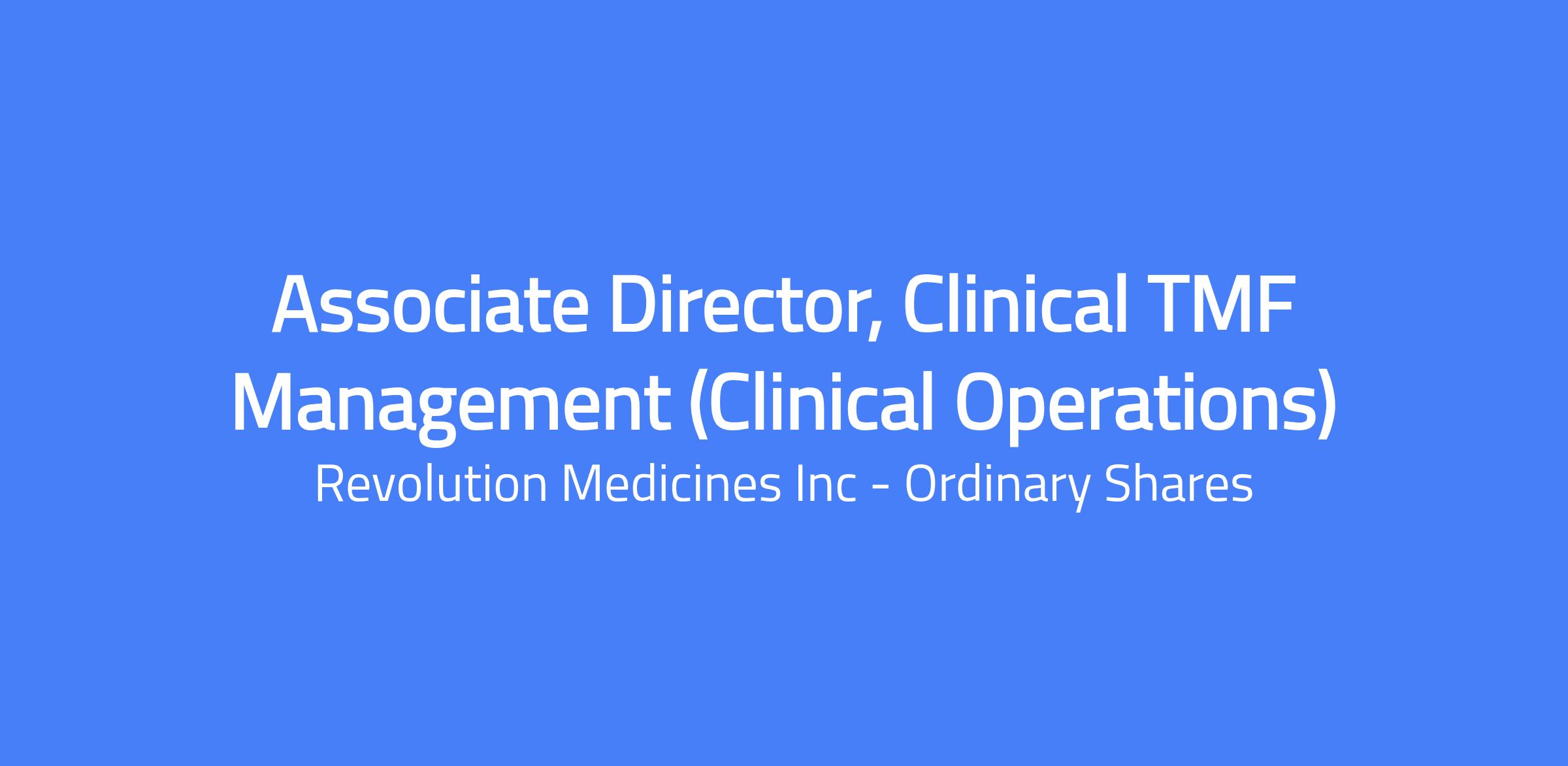 This is a unique opportunity for a Trial Master File (TMF) Management Professional who has innate leadership and organizational skills, technical expertise in clinical Trial Master File management in an industry setting, and experience in the development and implementation of clinical systems strategy. As Associate Director Clinical TMF Management, you will be a key member of the Clinical Operations Excellence (CORE) team, responsible for the development and oversight of the Trial Master File strategy and standards, in support of Revolution Medicines (RevMed) clinical trials.