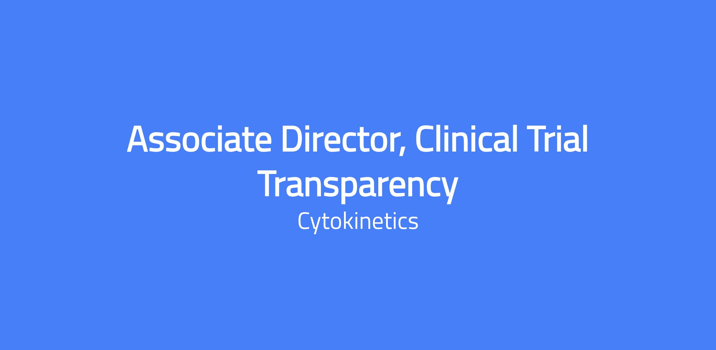 Associate Director, Clinical Trial Transparency (CTT) at Cytokinetics. Responsible for supporting and overseeing all aspects of CTT, partnering with Regulatory Strategy, Medical Writing, and SMEs. Lead development of CTT deliverables including Clinicaltrials.gov postings, EU CTIS postings, plain language summaries, and redaction packages, and help assess processes and standards for CTT content.