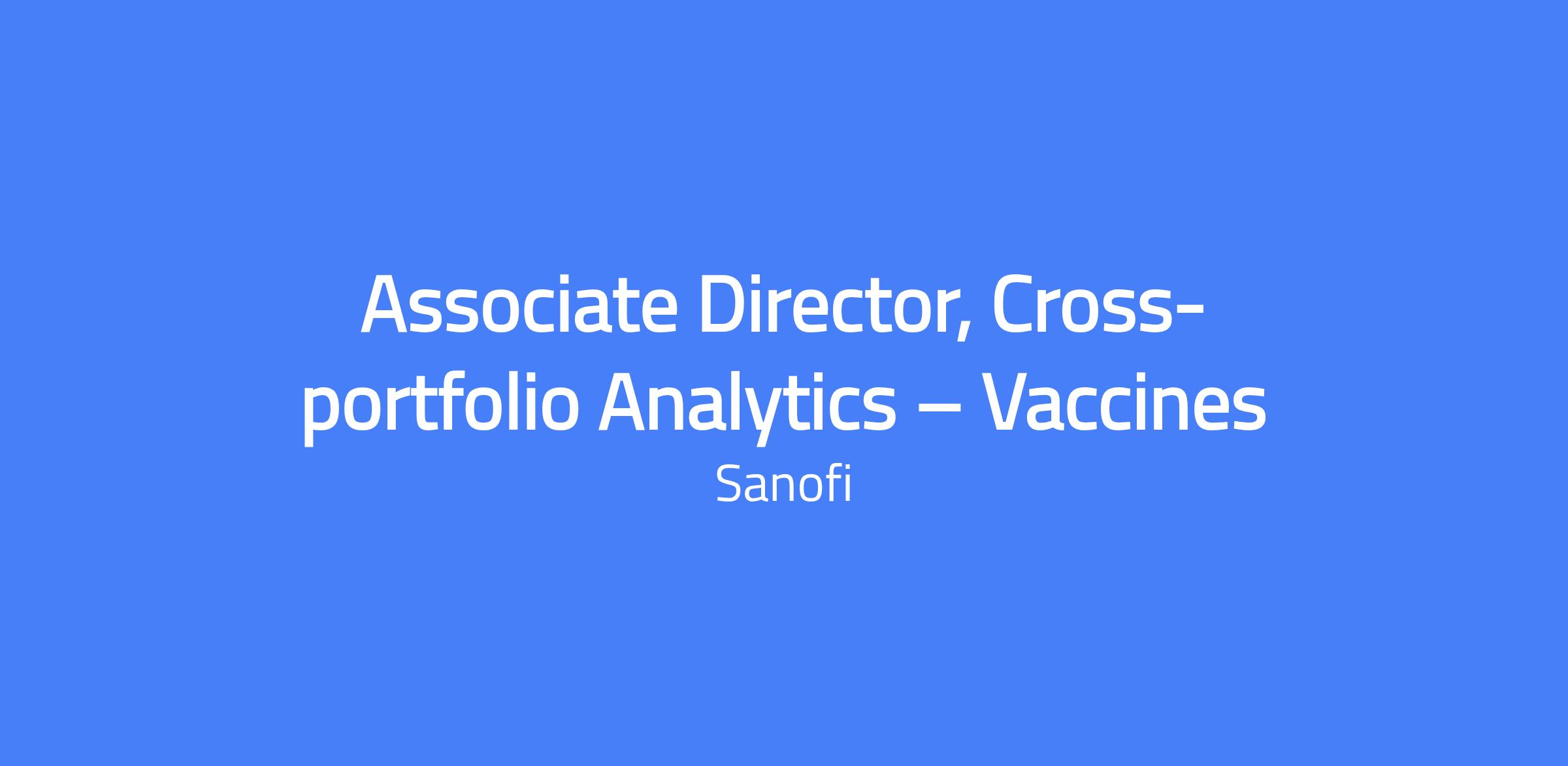 Associate Director, Cross-portfolio Analytics β Vaccines, based in Morristown, NJ. Responsible for reporting and presenting Sanofi's portfolio performance and integrated insights to leadership as a member of the Insights and Analytics team, focusing on analyzing launched assets and preparing for future launches, and proactively identifying opportunities using claims, SP, and CRM data.