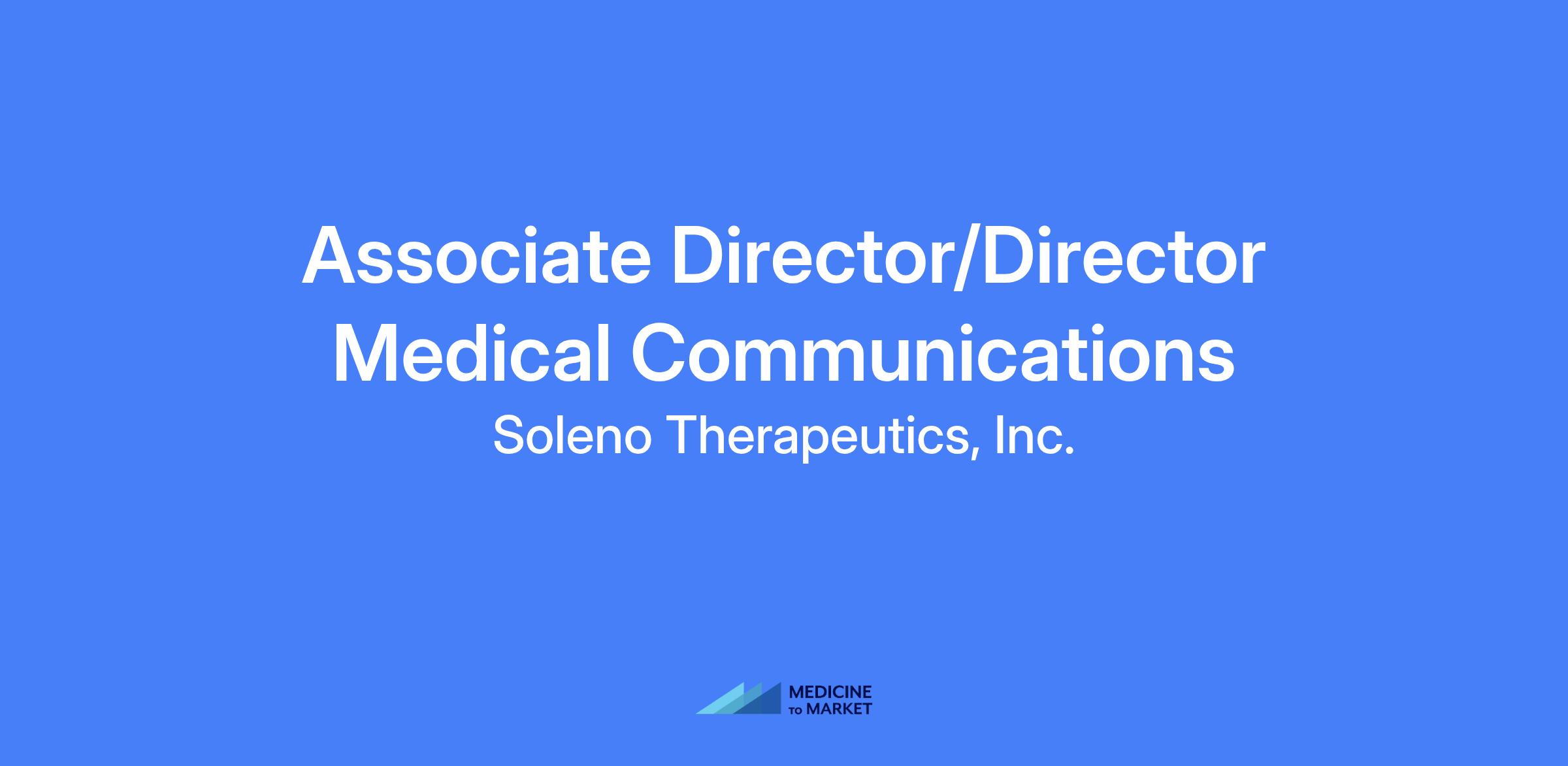 Associate Director/Director, Medical Communications will work on a high-performing team responsible for Medical Information and Communications, Medical Review activities and Medical Operations. The role is accountable for aligning and integrating process and technology efficiencies for Medical Affairs, Medical Information and Communication and review activities, and serves as a champion for modern medical affairs at Soleno.