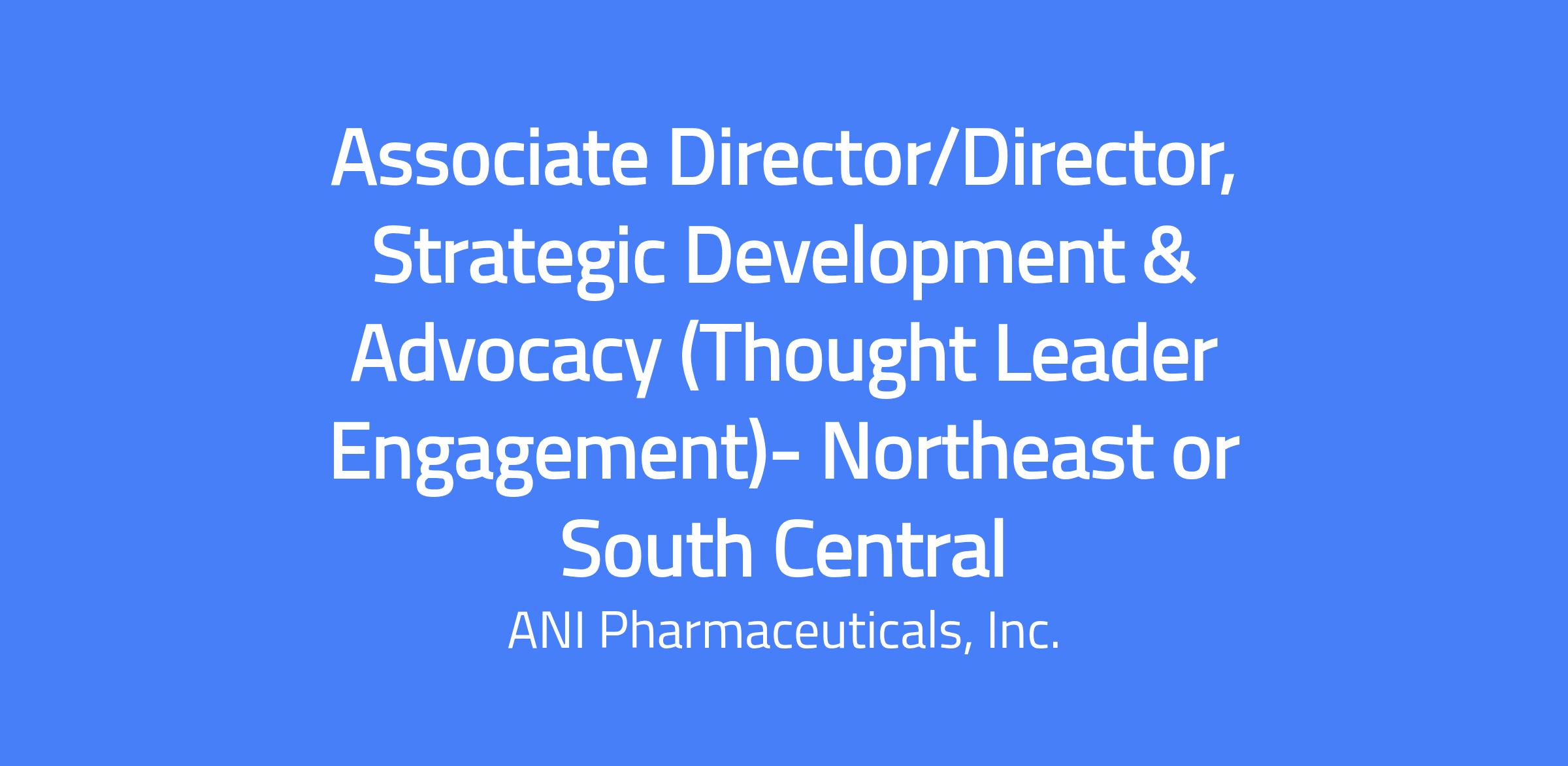 Associate Director/Director, Strategic Development & Advocacy (SD&A) is a field-based marketing role responsible for building advocacy and support for ANI Rare Diseaseβs first US-based branded product. This entails engaging national, regional and global Thought Leaders, forging strategic partnerships with advocacy organizations, and gathering insights to help develop marketing strategy. The role collaborates with the Marketing Lead responsible for Commercial Advisory Boards and other consultancy arrangements, supports Speaker Programs, and participates in sponsorships and Patient Advocacy Organizations engagement on behalf of marketing. The position requires cross-functional collaboration, anticipation of market trends, and delivering results in line with ANIβs ethical business practices.