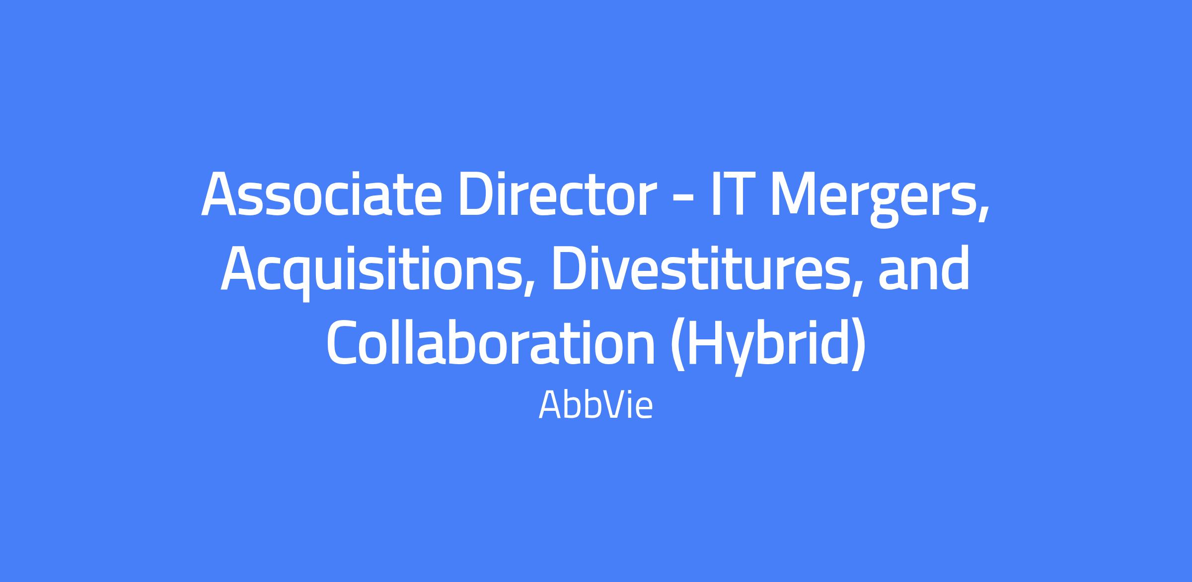 Associate Director, Mergers, Acquisitions, Divestitures and Collaborations leads the BTS integration effort for deal transactions, coordinating cross-functional teams to plan and execute integration or divestiture activities that achieve AbbVie’s end-state operating model. The role serves as the primary BTS Integration Lead, partnering with business leadership, Search and Evaluation, Business Development, and the Transition Office to define strategy, drive cross-functional execution, and deliver business value across AbbVie’s therapeutic areas. This is a global, hybrid role focused on accelerating value through technology and data-driven initiatives.