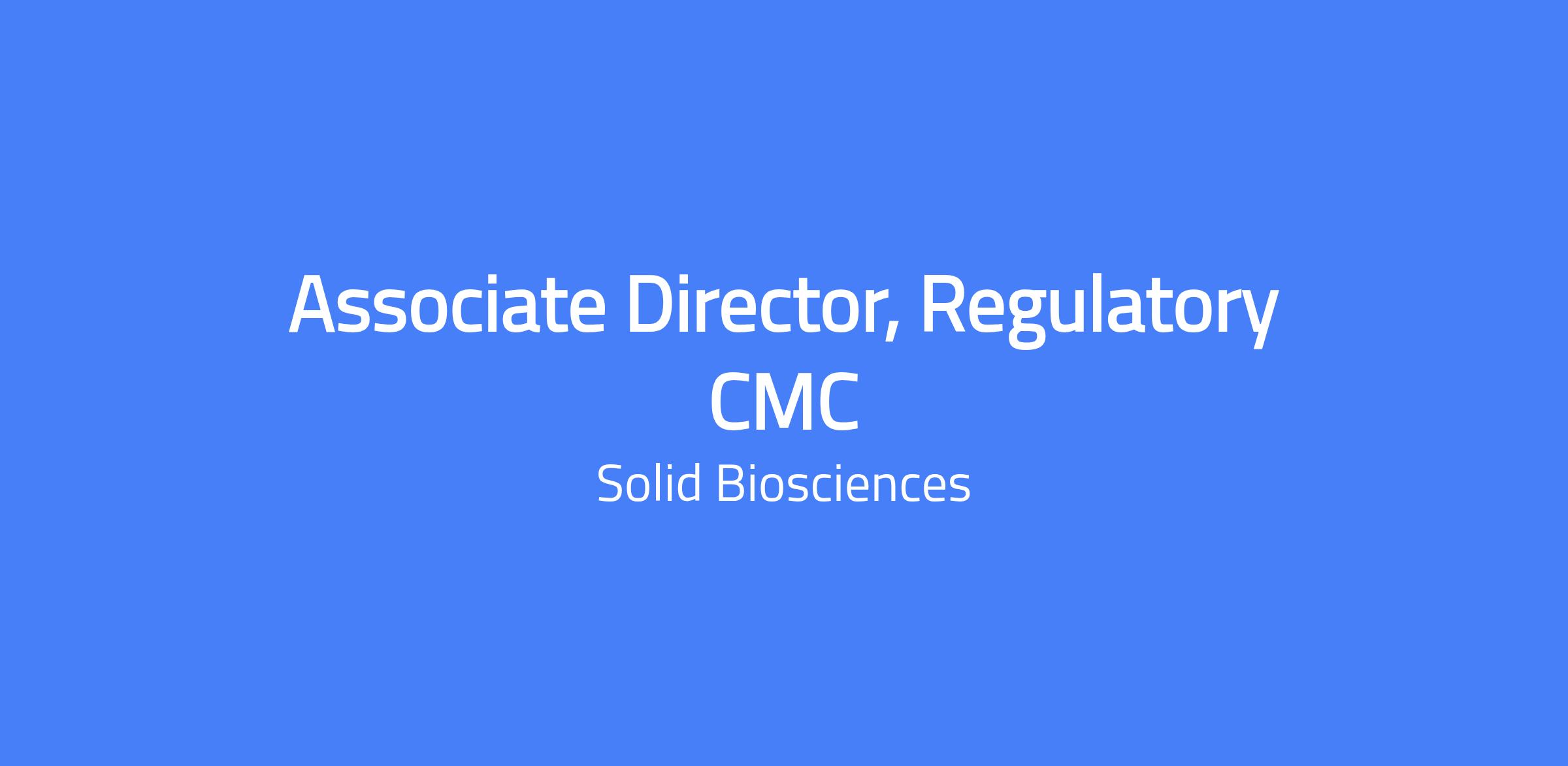 Associate Director, Regulatory CMC β Charlestown, MA. Lead regulatory CMC activities for gene therapy programs, partnering across interdisciplinary teams and external partners. Drive global regulatory CMC strategies, contribute to agency interactions and submissions, and participate in industry trade groups to influence the broader regulatory community. This role supports later-stage development of programs such as SGT-003 and reports to the Head of Regulatory CMC with a hybrid work arrangement.