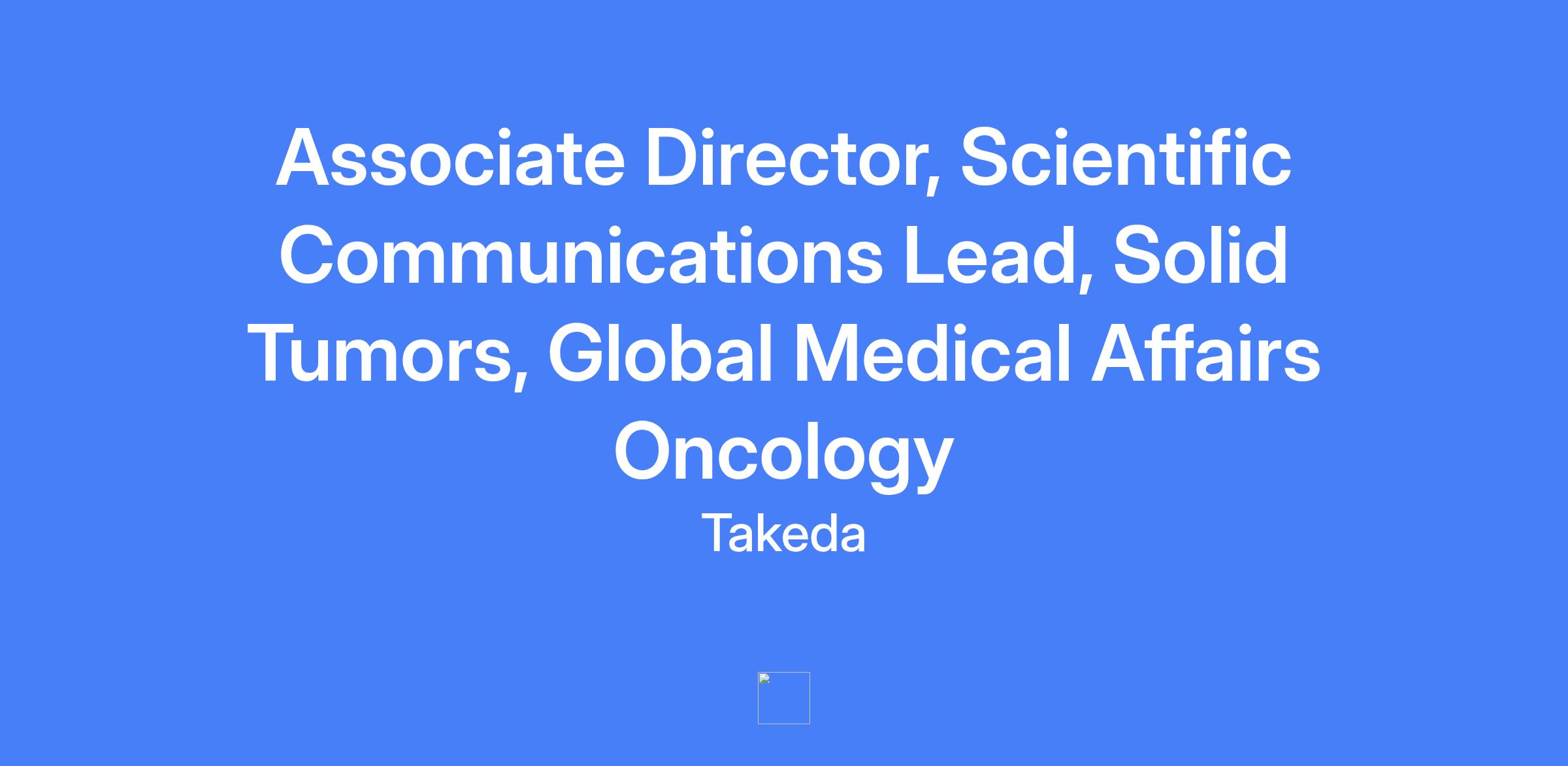 Associate Director, Scientific Communications Lead, Solid Tumors, Global Medical Affairs Oncology. As a member of Takeda Oncology, contribute to the vision to cure cancer by driving publication and scientific communications strategy and deliverables for assigned oncology assets. Lead cross-functional collaboration, manage publications planning, and ensure scientific rigor and compliance across programs. Serve as primary liaison with internal and external stakeholders and guide the development of foundational scientific content and materials.