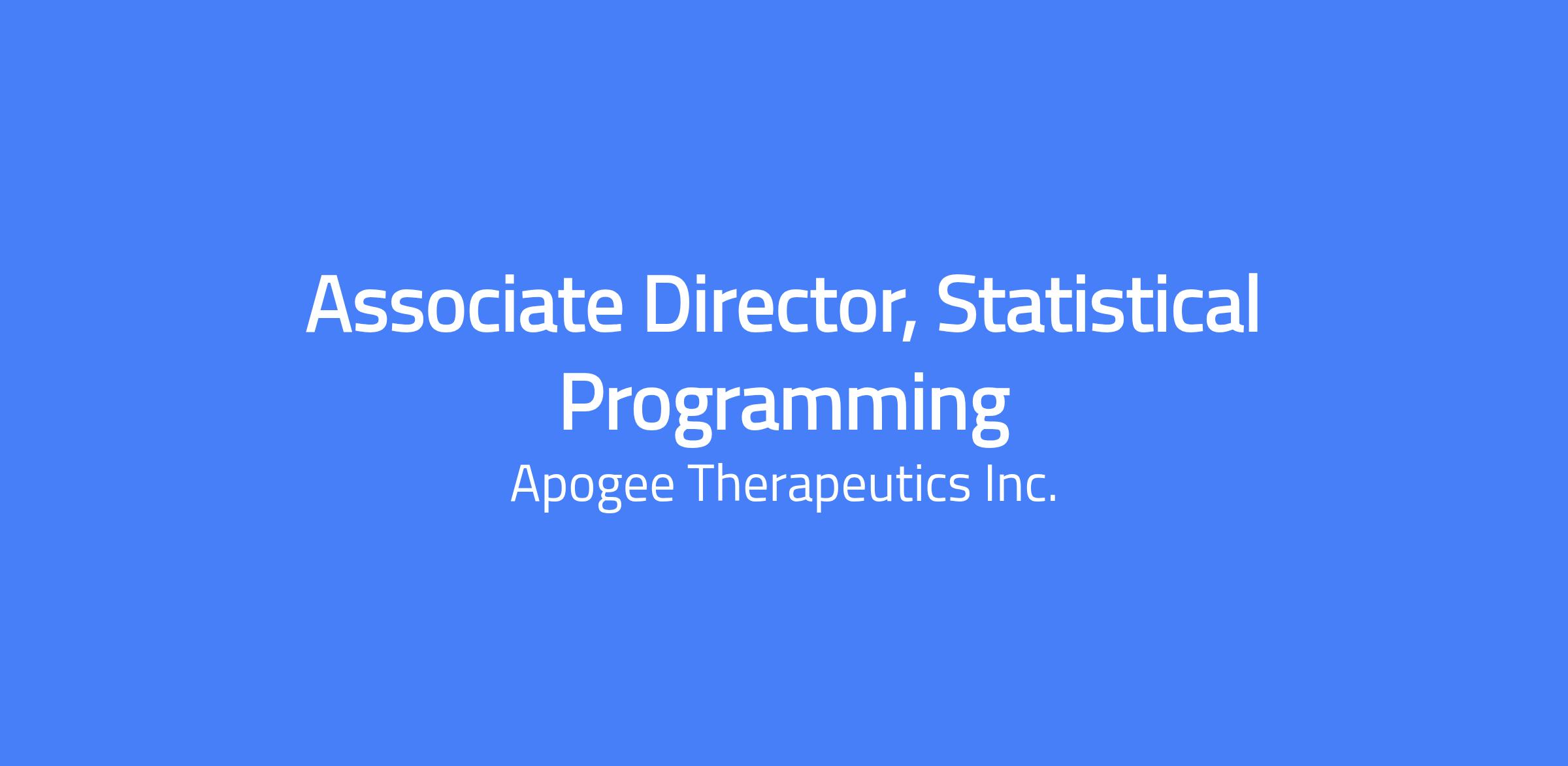 We are seeking an Associate Director of Statistical Programming. In this position you will be responsible for leading statistical programming activities to support various clinical trial projects. You will also support building programming processes for clinical studies and submissions as they relate to clinical goals to ensure successful execution of Apogee’s clinical programs. You will manage programmers and CROs, oversee programming activities and provide timely support to the cross-functional teams on statistical programming matters according to the project strategies and requests.
