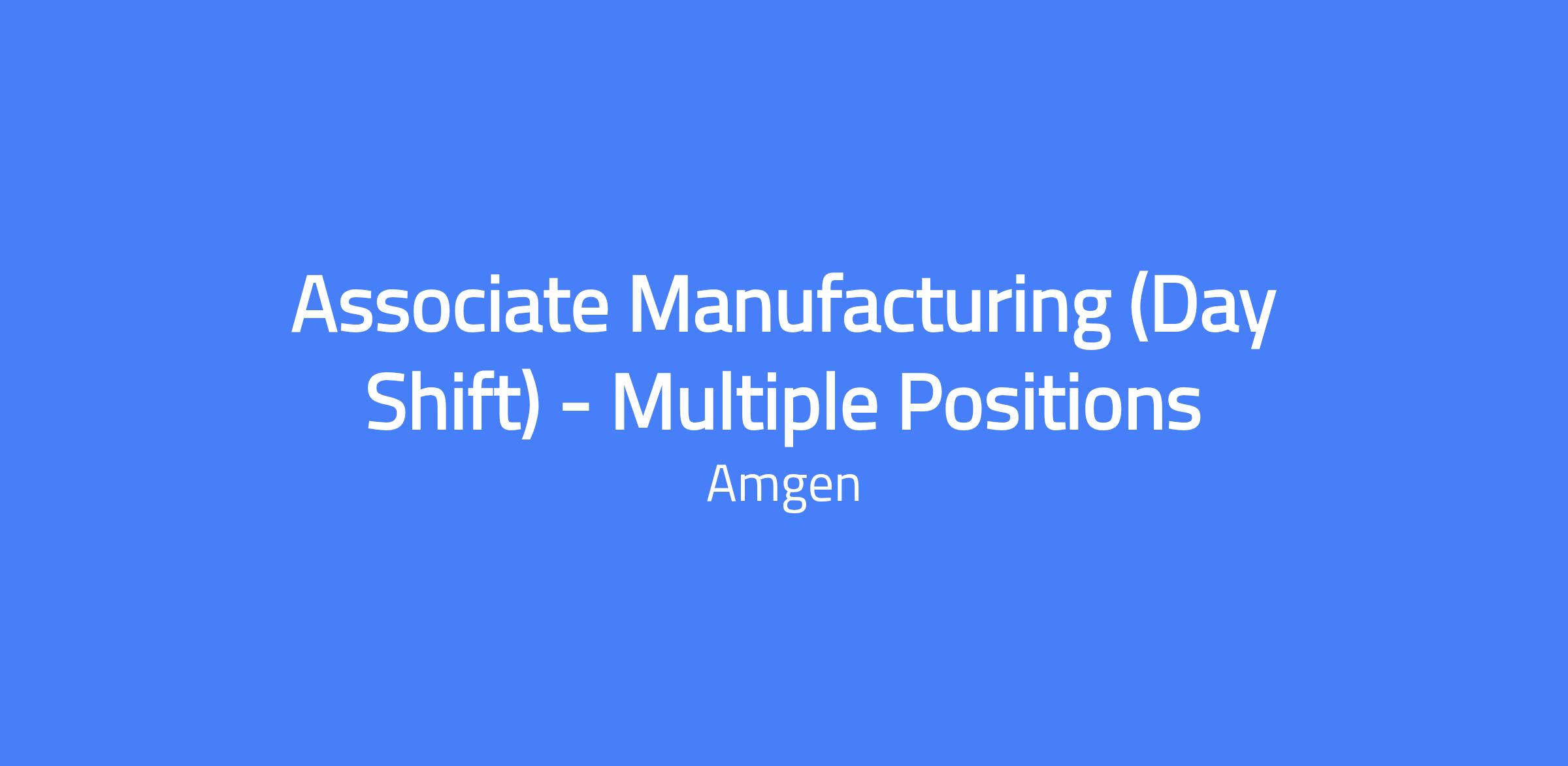 Associate Manufacturing (Day Shift) โ Multiple Positions. This role supports Amgen's 24/7 drug substance manufacturing operations at Amgen North Carolina (ANC). The position is on the floor in the manufacturing services area, performing cGMP drug substance manufacturing on a 12-hour 2-2-3 schedule (5:45 am to 6:15 pm). The role requires adherence to cGMP procedures and collaboration with cross-functional teams to ensure safe, compliant production.