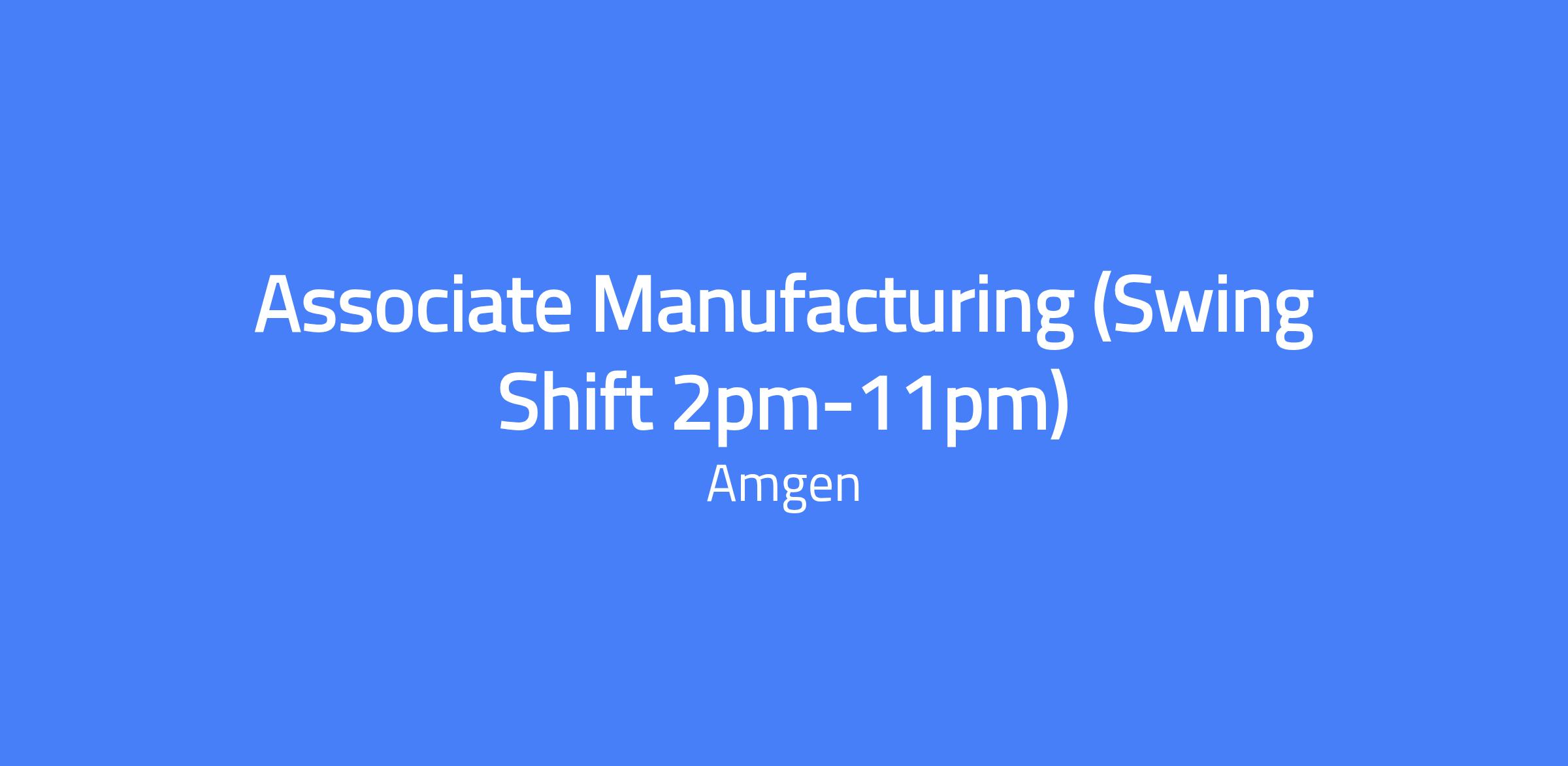 Associate Manufacturing (Swing Shift 2pm-11pm) at the Thousand Oaks site. You will collaborate with multiple functions (Quality Assurance, Quality Control, Engineering, Facilities, Maintenance, Process Development, Process Engineering) to develop a deep understanding of manufacturing operations and planning activities. This role includes performing drug product manual visual inspections, reviewing manufacturing batch records, maintaining a safe and compliant culture, creating and revising standard operating procedures, leading cross-functional continuous improvement initiatives, performing data analysis of critical process parameters, developing task schedules, monitoring productivity, and managing quality records such as non-conformances and CAPAs.
