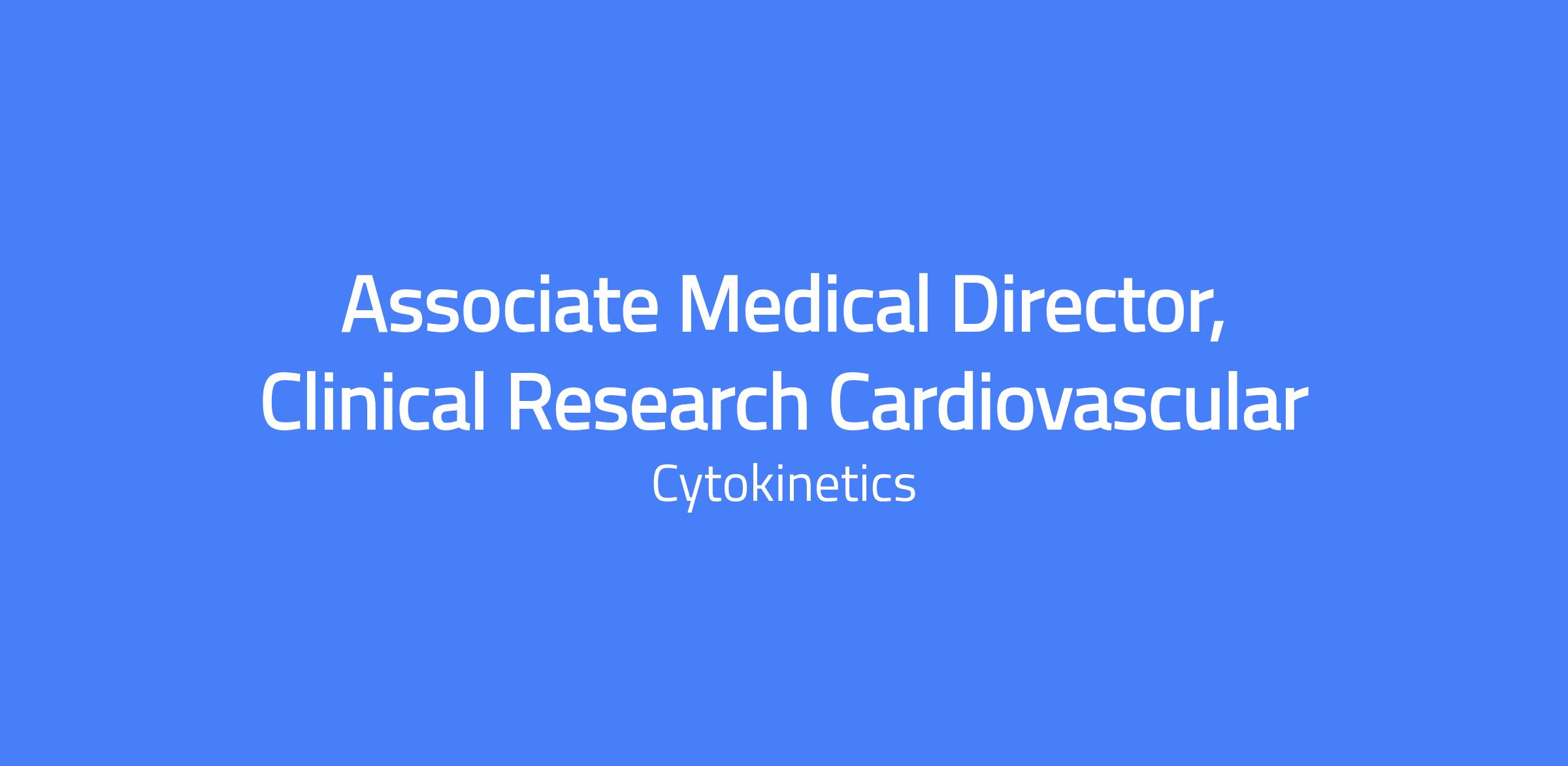 Associate Medical Director, Clinical Research Cardiovascular at Cytokinetics. Provide clinical oversight to cardiovascular development programs and trial activities, including advisory board management, protocol design, site recruitment/implementation, monitoring, data interpretation, and reporting. Support and contribute to studies in heart failure and hypertrophic cardiomyopathy (HCM) from Phase I to III, and assist with future IND, Phase I-III, and NDA submissions. This is a remote role located within the United States.