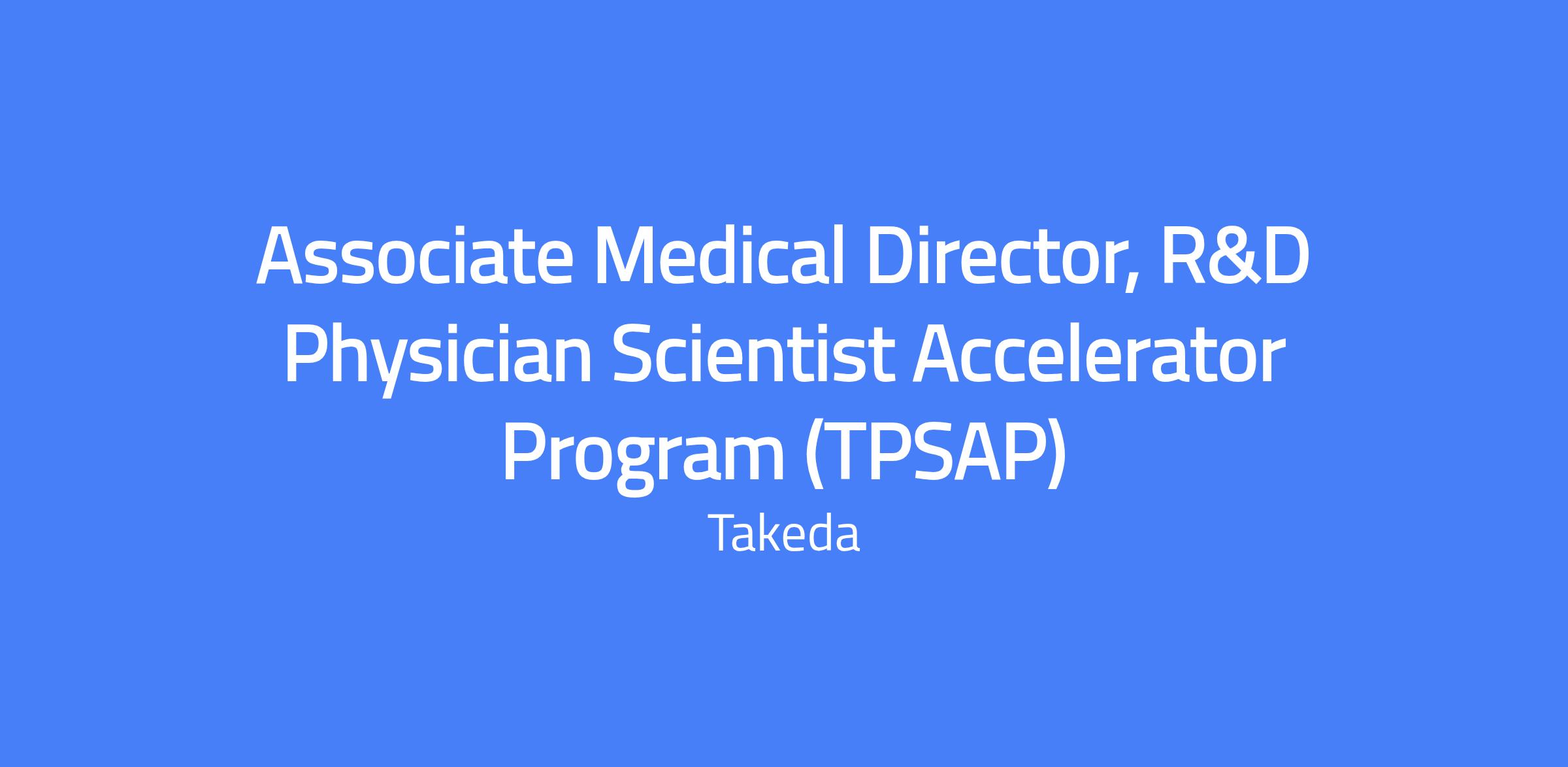Associate Medical Director in Takeda's R&D Physician Scientist Accelerator Program (TPSAP) based in Cambridge, MA. The role is part of a 2-year program designed to develop future leaders in the biopharmaceutical industry through rotations, a formal drug development curriculum, and leadership development through coaching and mentorship.