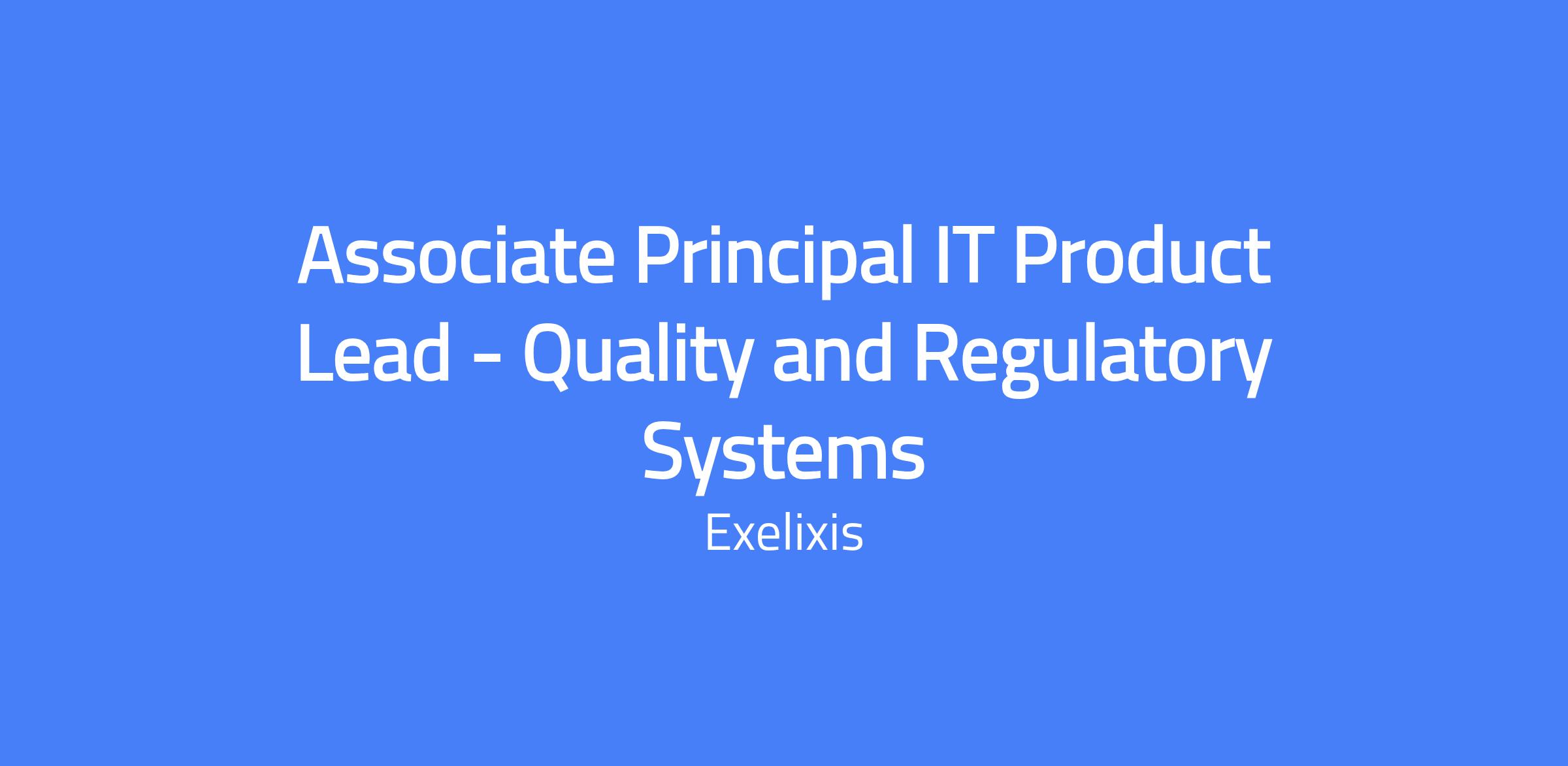 The Associate Principal IT Product Lead - Quality and Regulatory Systems will lead a portfolio of digital products essential to Exelixis's strategy to accelerate the development and commercialization of medicines. This role drives the strategy, development, and operational excellence of the digital application ecosystem, aligning with business objectives and focusing on user experience and value delivery. Working within a product-centric model, the role defines product roadmaps, fosters cross-functional collaboration, and leads agile product teams to deliver innovative digital solutions that accelerate drug discovery, development, and commercialization.