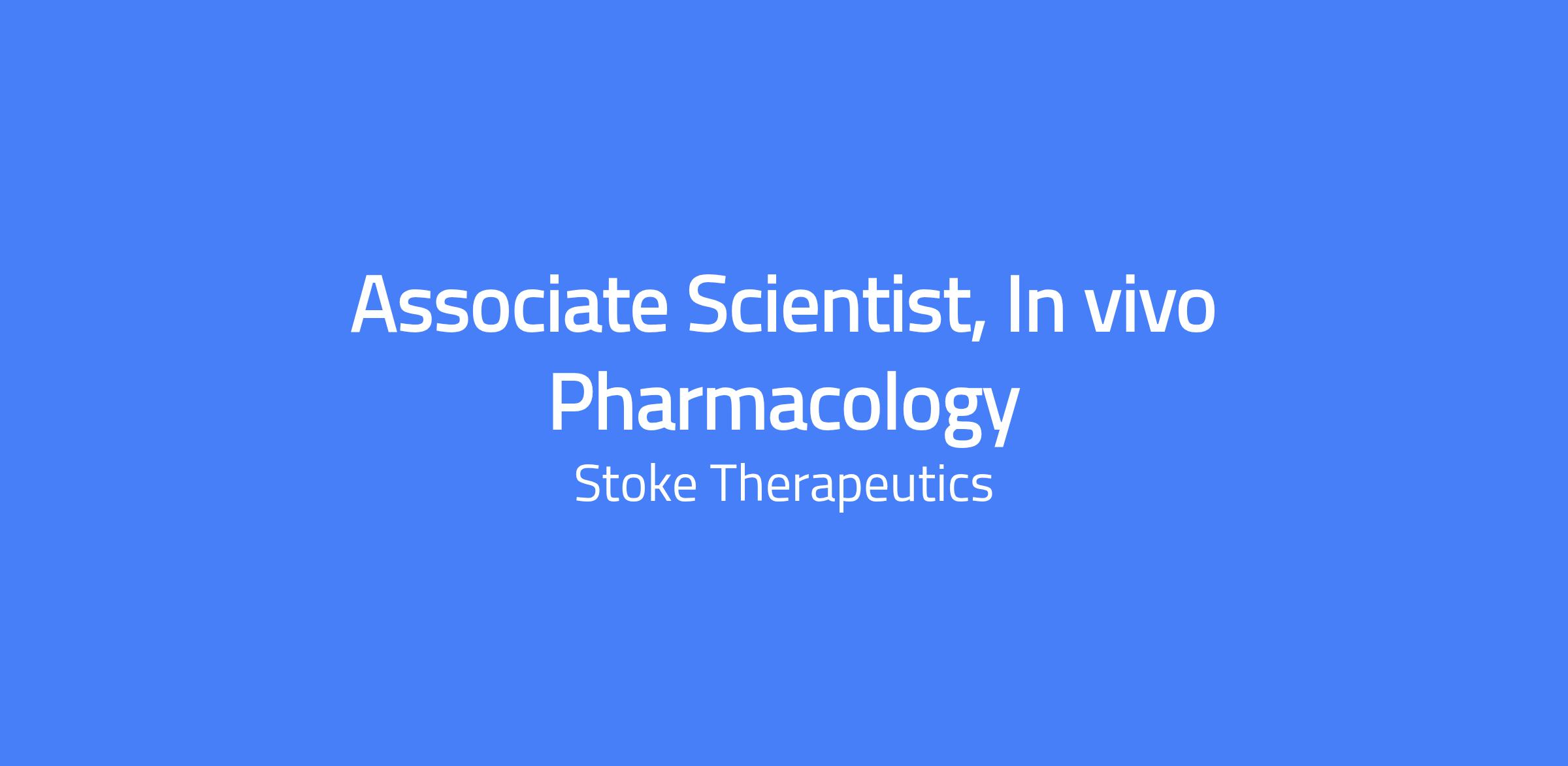 Stoke is seeking an enthusiastic and highly motivated Associate Scientist to join the In Vivo Pharmacology Department. This position is an opportunity to learn new techniques and concepts, be creative, and grow with a growing company. Location: Bedford, MA (in-person; move to Waltham, MA by end of 2026).