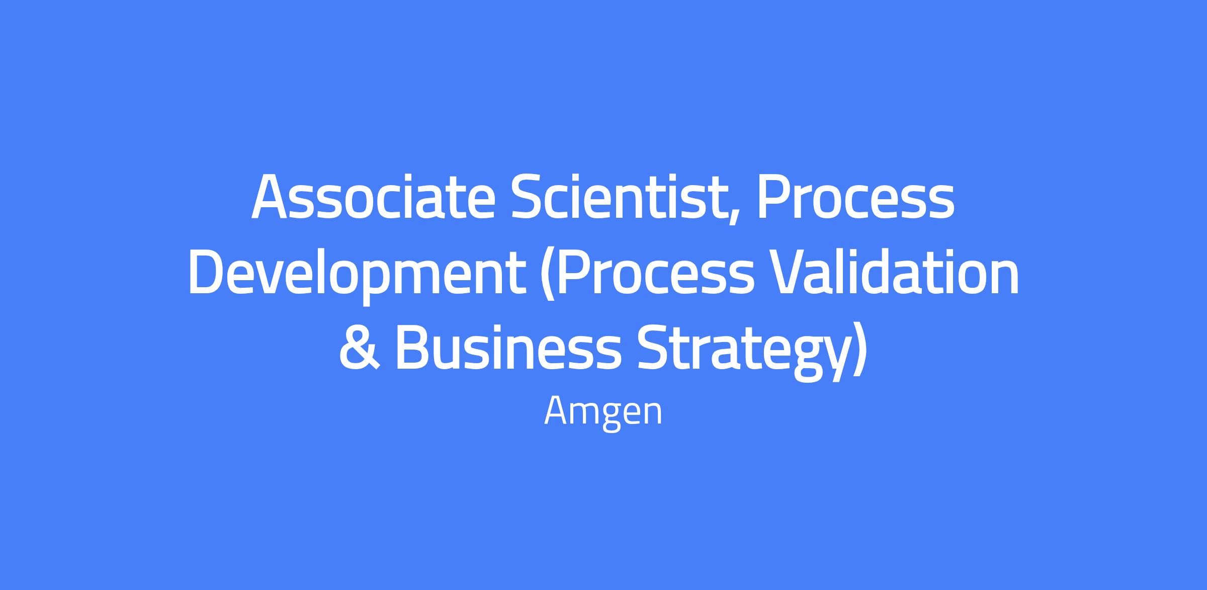 Associate Scientist, Process Development (Process Validation & Business Strategy) at Amgen. Part of the Process Development Drug Substance Technology group (PD DST) within the Process Validation & Business Strategy team, this role operates across all aspects of a commercial bulk drug substance facility, including process development operation support, developing digital tools to support business processes, and supporting the commercial development of Amgen’s pipeline.