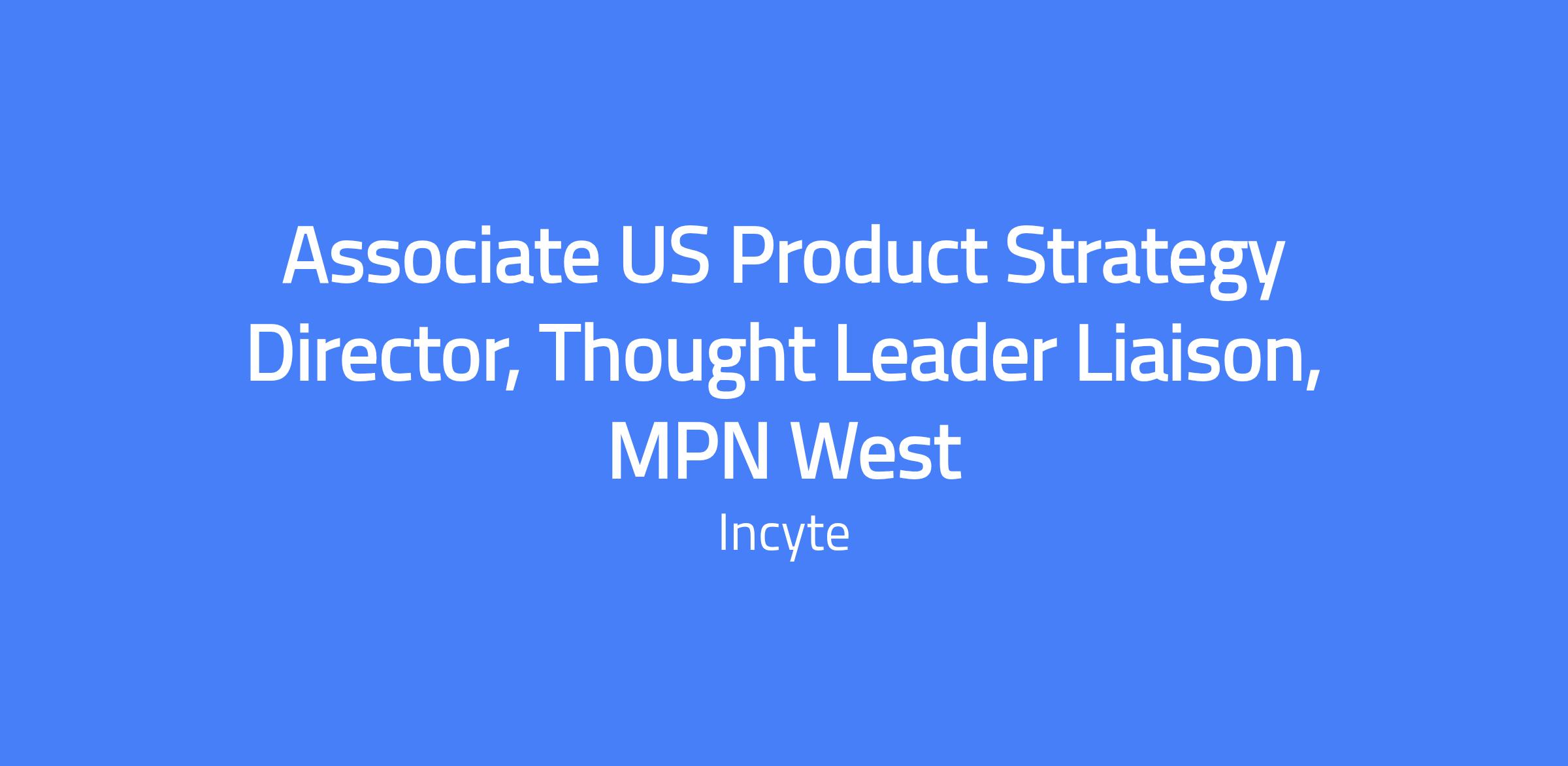 Role: Associate US Product Strategy Director, Thought Leader Liaison, MPN West. The US Thought Leader Liaison on the US Product Strategy Team at Incyte serves as a strategic bridge between the company and Key External Experts (KEEs) in the MPN space. Reporting to the Head of US Marketing – MPNs, the TLL shapes and executes brand strategies by fostering relationships with regional KEEs, facilitating treatment landscape discussions, and capturing insights. They act as a central point of contact for KEEs within the West Area, ensuring compliance with company policies and cross-functional collaboration with Sales, OCNEs, Medical Affairs, Market Access, and R&D. They translate market opportunities into timely feedback for internal teams.