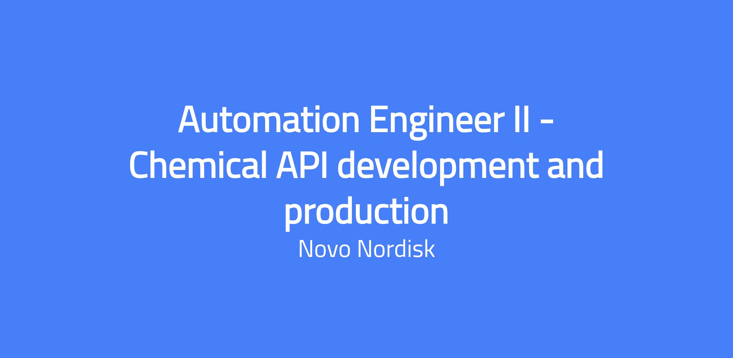 Automation Engineer II - Chemical API development and production at Novo Nordisk in Petersburg, Virginia. Works with local and global project teams to ensure process and equipment designs comply with local and global standards, and to improve reliability of process control systems to meet regulatory requirements. Serves as SME for process control systems, supports audits, and facilitates training and change management. Open to hiring at a more senior level commensurate with experience.