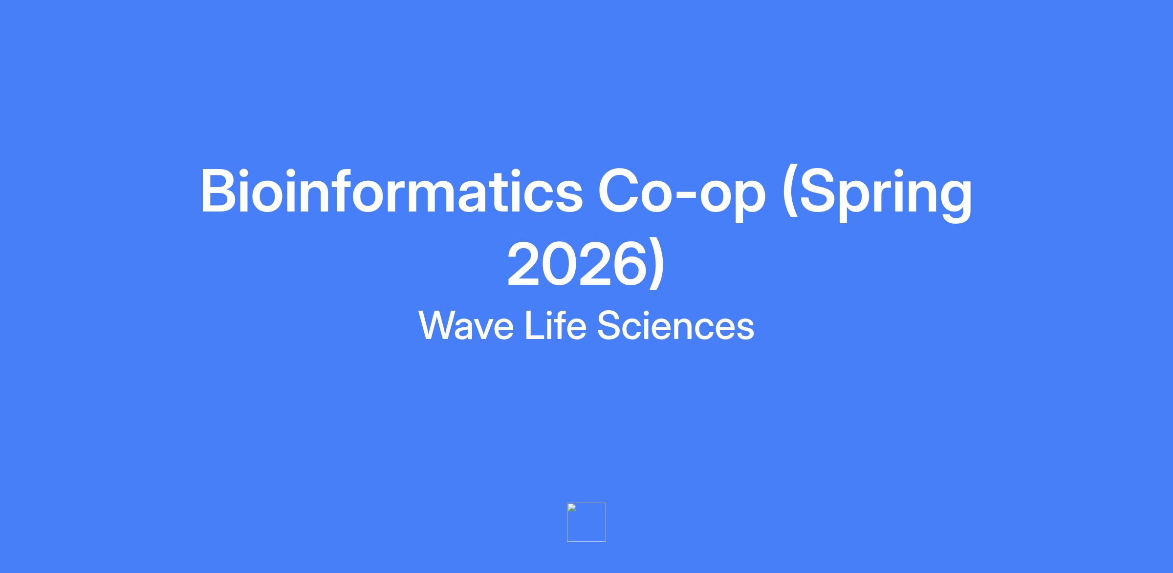 Bioinformatics Co-op (Spring 2026) at Wave Life Sciences. Support bioinformatics, computational biology, and human genetics efforts in drug discovery programs; design and execute sequence-based machine learning projects and develop tools for oligonucleotide therapeutics.