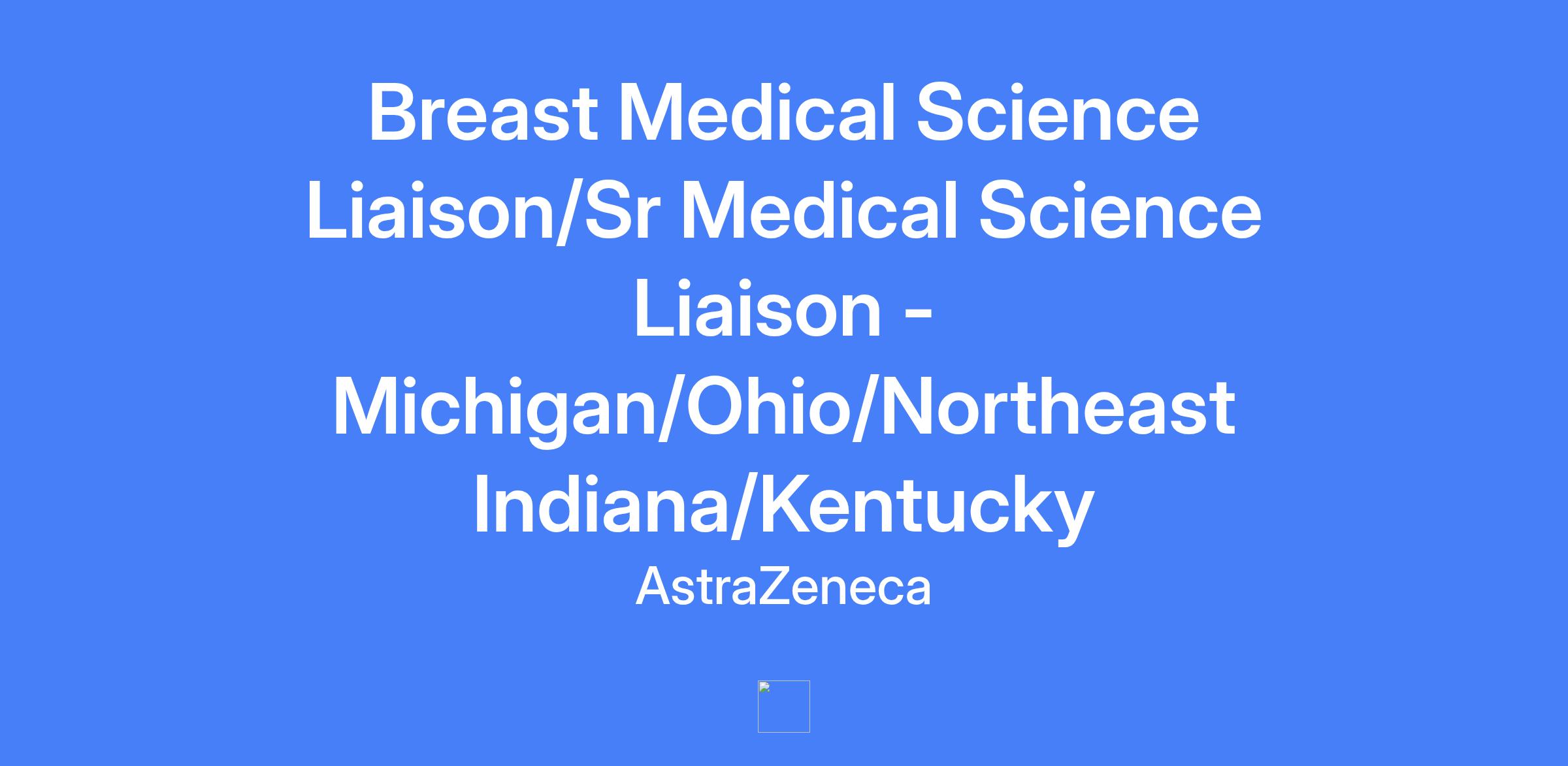 Medical Science Liaison (MSL) or Senior MSL for Breast Oncology, serving as the local medical voice in the disease area and building a local medical strategy to improve patient care and outcomes in the territory. The MSL is an established field-based professional with extensive scientific, clinical, and therapeutic area expertise responsible for providing medical and scientific support for AstraZeneca's oncology products, new indications for current products, and compounds in development. Territory includes Michigan, Ohio, Northeast Indiana, and Kentucky.