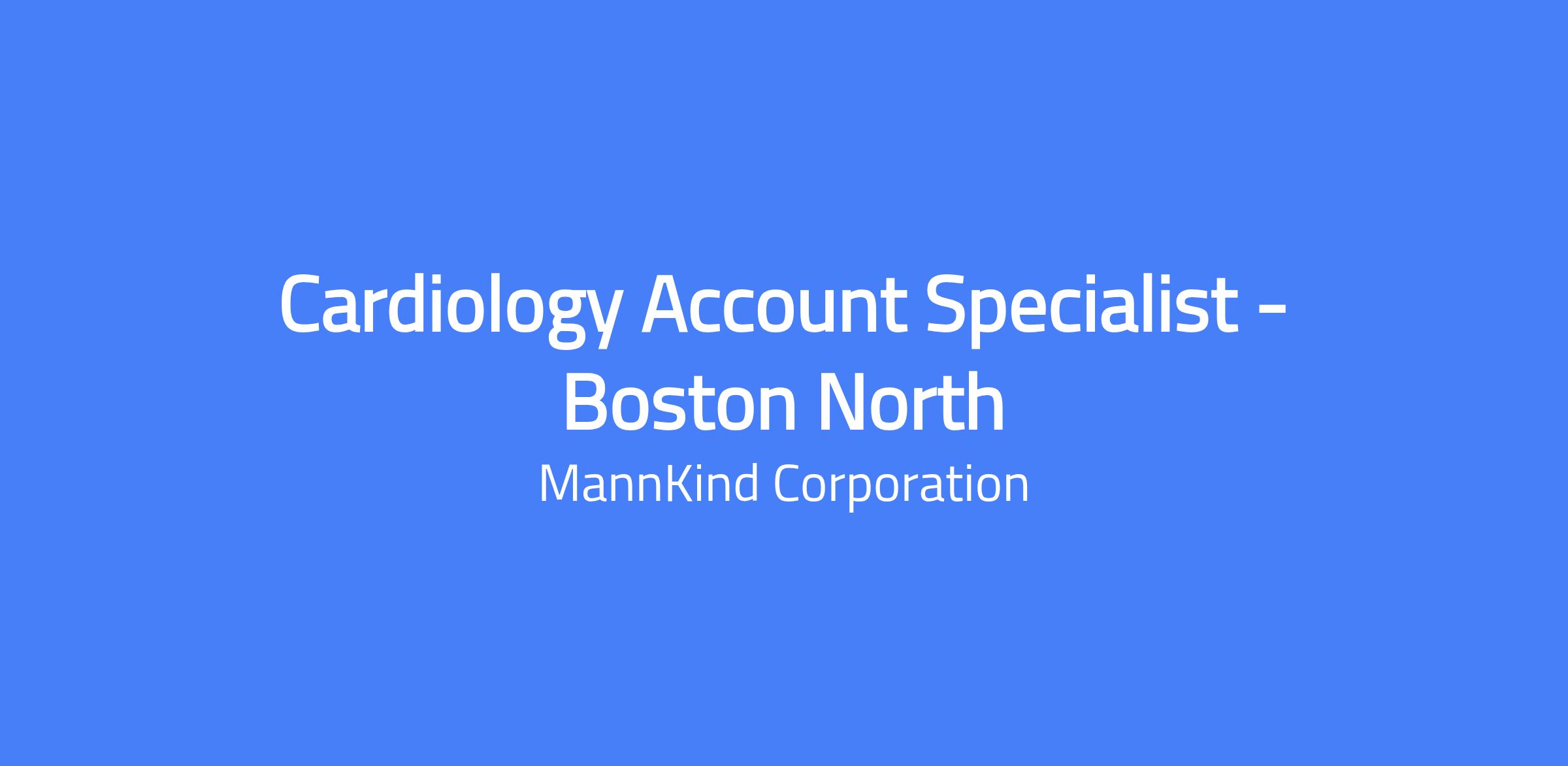 Cardiology Account Specialist - Boston North will drive utilization of MannKind's inhaled therapies among heart failure and cardiology settings, manage territory relationships, and execute strategic territory plans. This position reports to the Regional Sales Director.