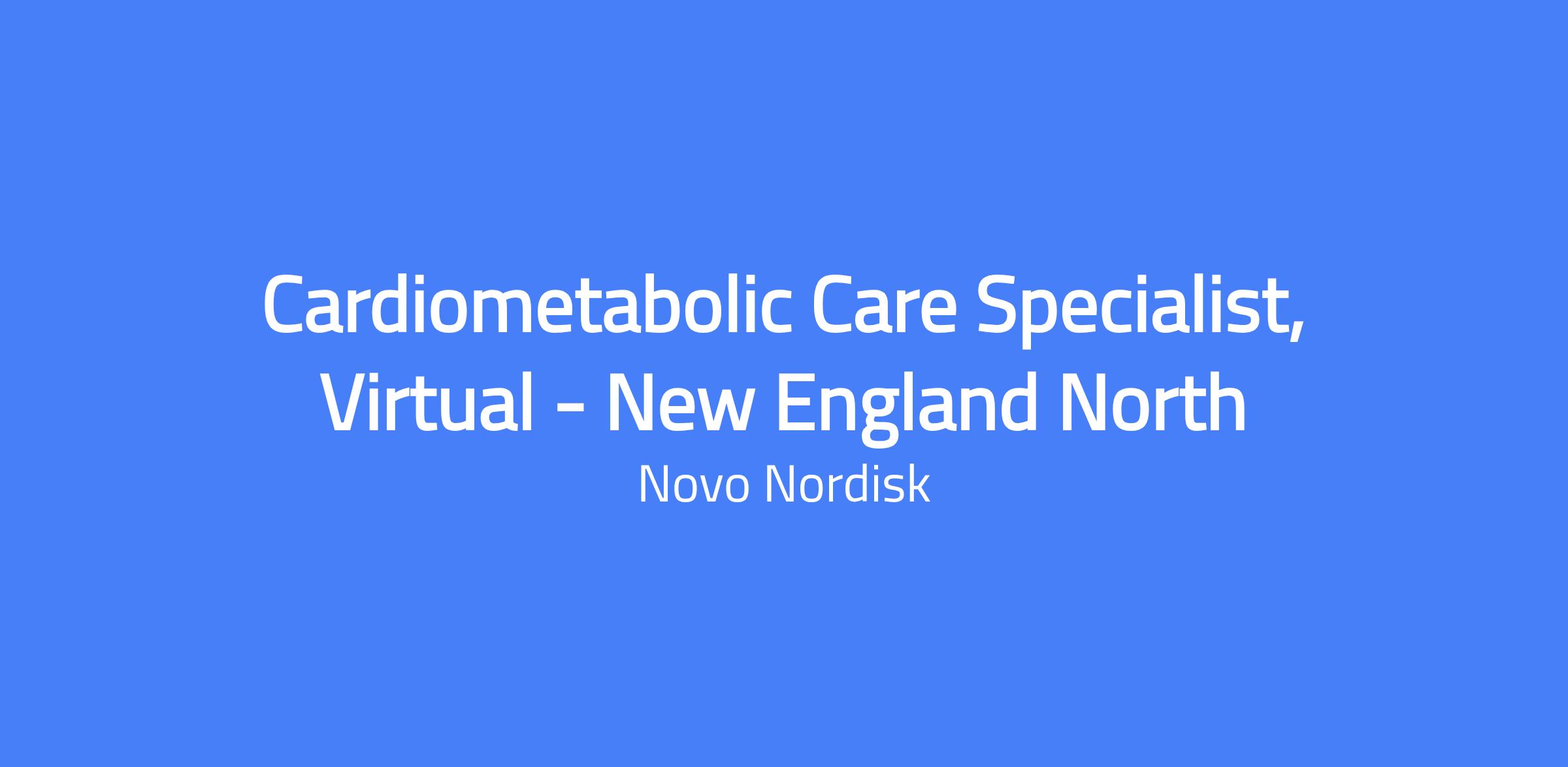 Cardiometabolic Care Specialist, Virtual - New England North. Responsible for achieving sales goals by implementing marketing and sales strategies to promote Novo Nordisk's cardiometabolic portfolio to healthcare professionals and office staff through remote/virtual means, and for building clinical relationships to support patient management in the territory.