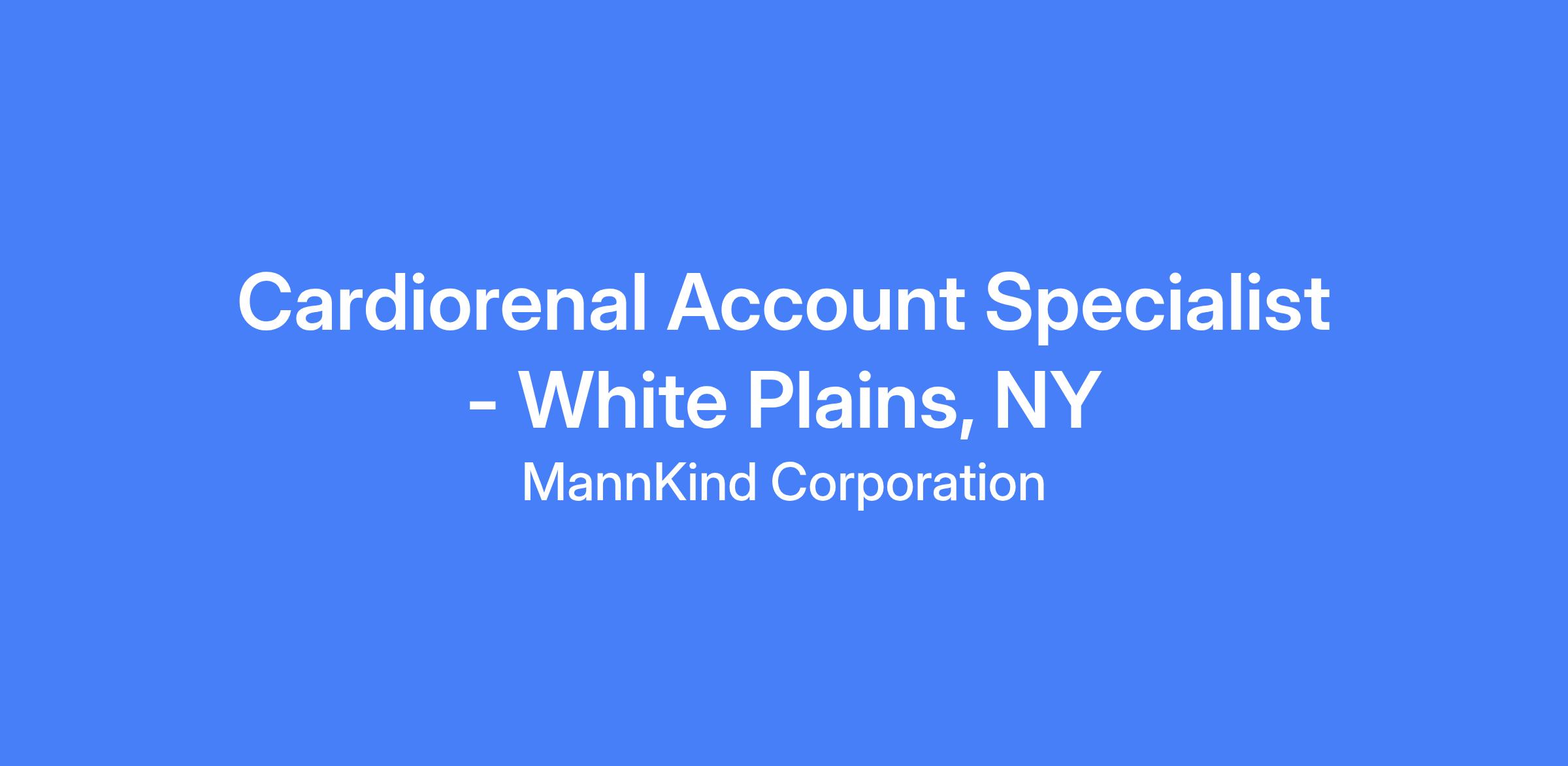 Cardiorenal Account Specialist role in White Plains, NY. Reports to the Regional Sales Director. Primary responsibilities include meeting and exceeding sales budgets, driving utilization of approved products within assigned accounts, and providing strategic input to support territory planning and execution.