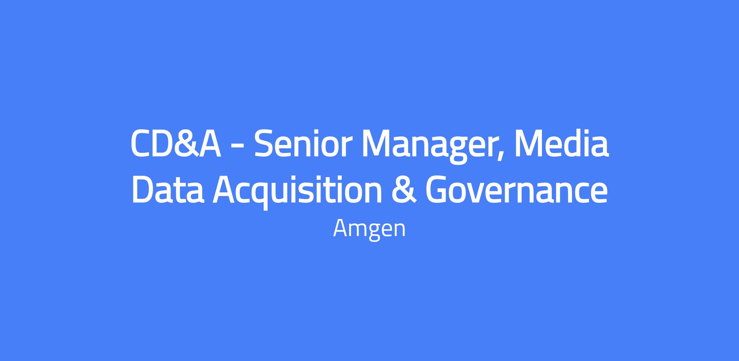 CD&A - Senior Manager, Media Data Acquisition & Governance. In this role you will lead Amgen’s media data acquisition and governance strategy, ensuring that data from agencies and publishers is accurate, compliant, and effectively leveraged to drive commercial and marketing insights. The role partners across Media Agency of Record, Commercial Data & Analytics (CD&A), Digital Technology & Innovation (DTI), Marketing, and Procurement to maintain strategic control of media data assets and define governance frameworks aligned with enterprise data standards.