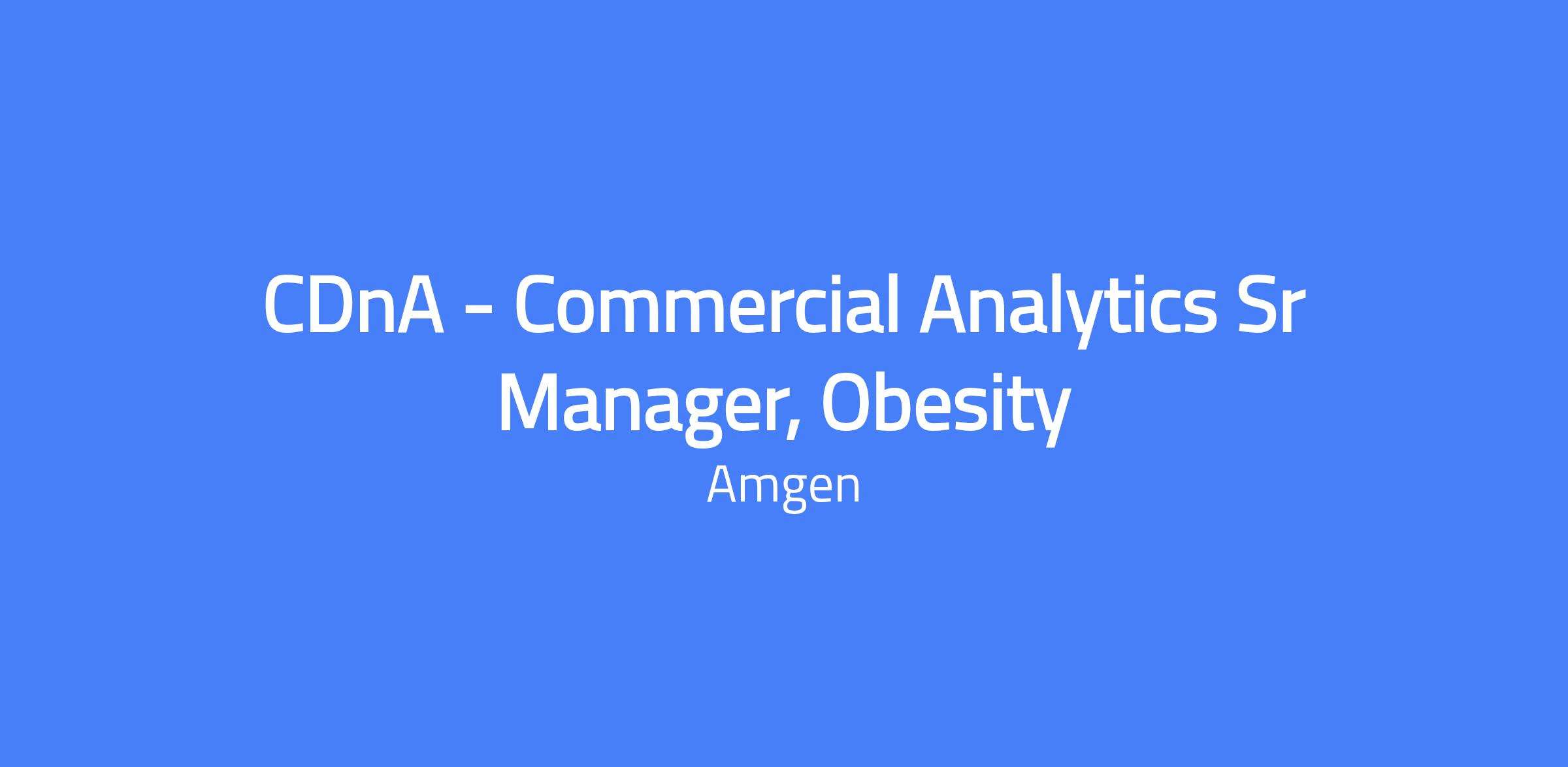 CD&A - Commercial Analytics Senior Manager, Obesity. Lead insights generation by integrating multiple secondary data sources and collaborating with Commercial Data and Analytics colleagues to develop a comprehensive understanding of the obesity market and provide tactical recommendations. Present findings and recommendations to Senior Leadership. Flexible commuter role to Thousand Oaks, CA; on-site a minimum of 3 days a week.