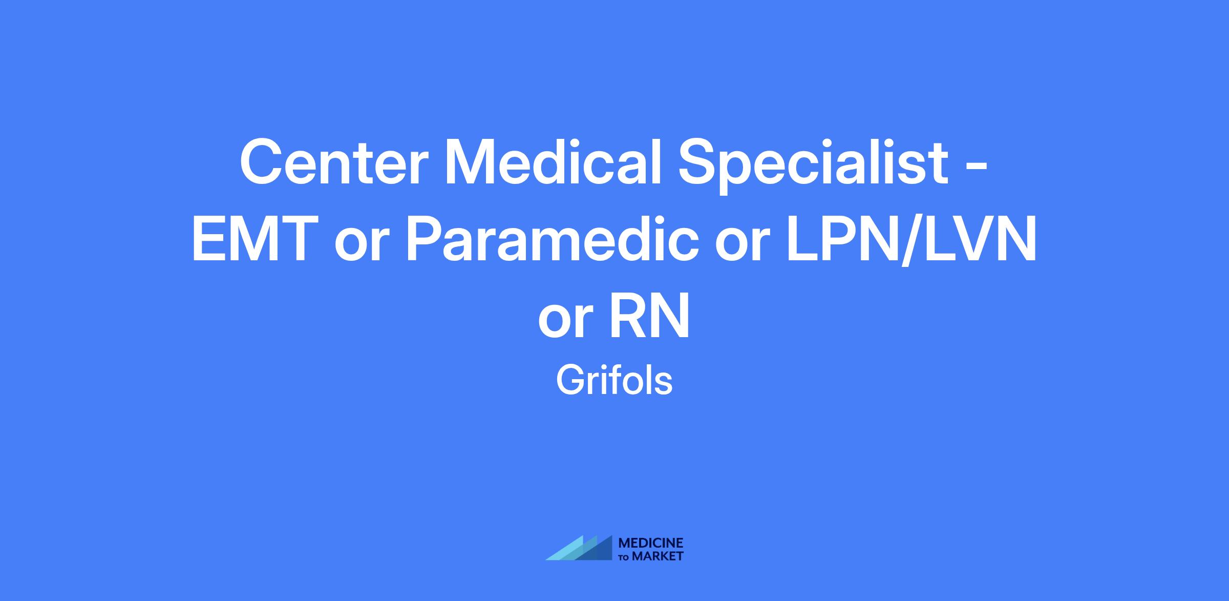 Center Medical Specialist position at Grifols Plasma Donation Centers. Uses EMT Basic/Advanced, Paramedic, LVN/LPN, or RN licensure to evaluate donor medical history, determine donor suitability, provide health education, and manage donor safety and adverse events.
