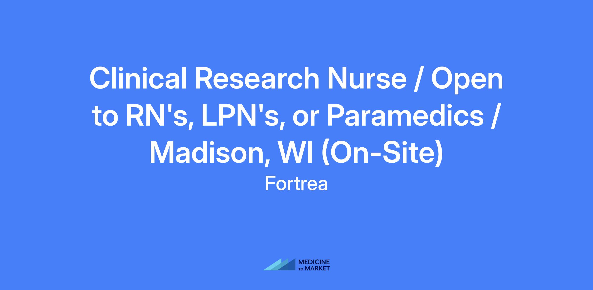 Clinical Research Nurse / Open to RN's, LPN's, or Paramedics in Madison, WI (On-Site). This is a full-time, office/clinic-based role within a leading Clinical Research Organization's Early Phase units, focusing on direct participant interaction, protocol reading, and execution of clinical research procedures in a fast-paced, team-oriented environment.