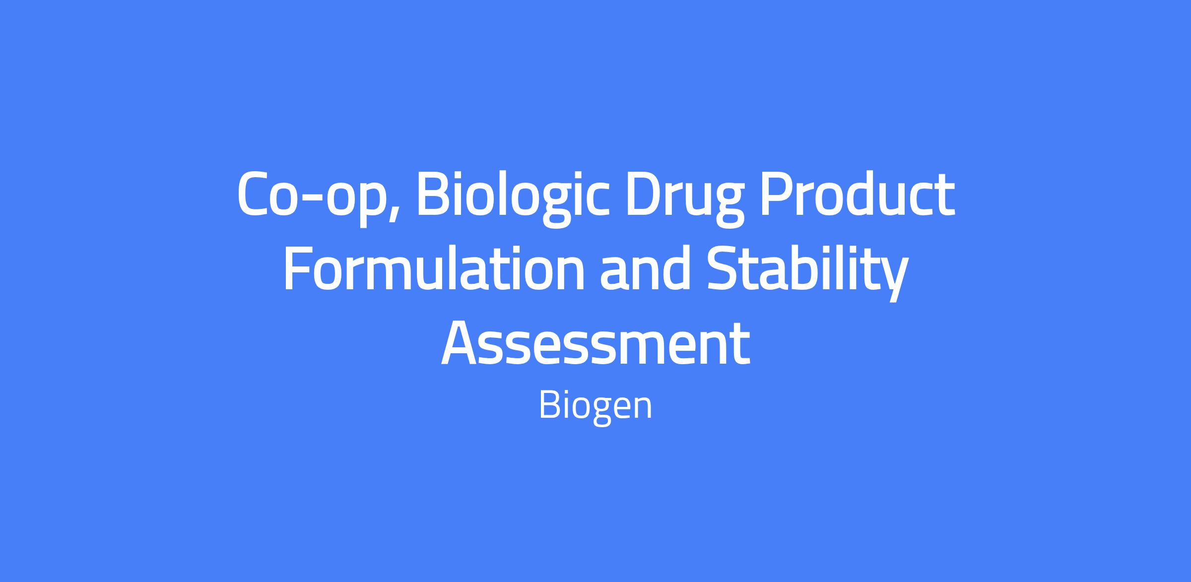 Co-op, Biologic Drug Product Formulation and Stability Assessment. This 6-month student role (July–December 2026) involves in-vitro evaluation of subcutaneous monoclonal antibody formulations, performing experiments, literature reviews, and data interpretation in a collaborative, fast-paced Biologic Drug Product Development environment at Biogen.
