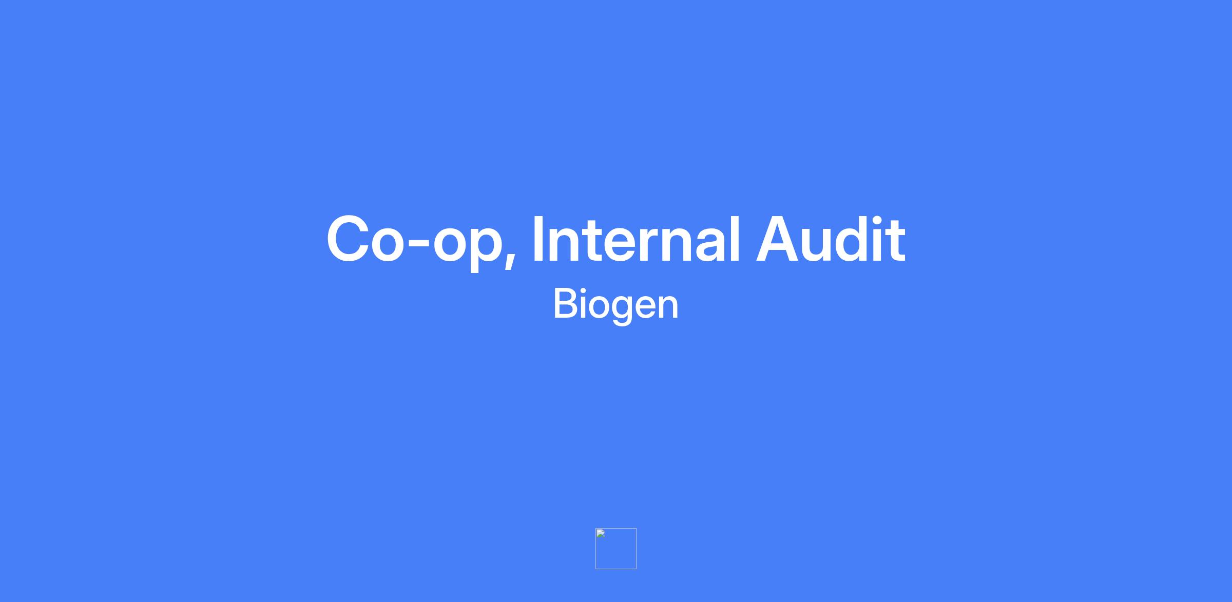 Co-op, Internal Audit. This 6-month student role (June–November 2026) supports Biogen’s Internal Audit department, contributing to the assessment of financial reporting reliability, compliance with laws and policies, and the efficiency of business operations. You will be part of audit teams working under the auditor-in-charge to meet audit objectives within deadlines.
