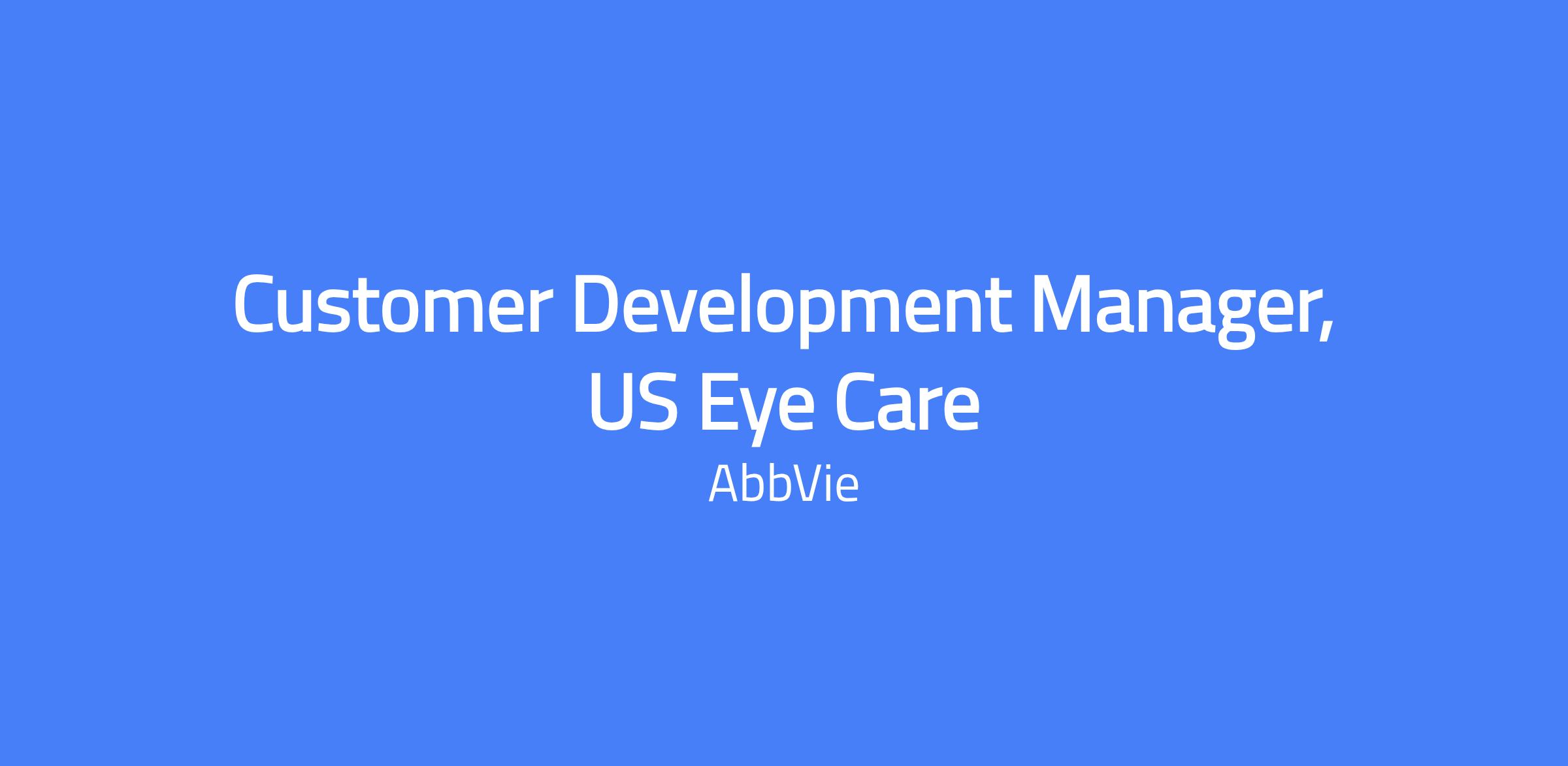 The Customer Development Manager (CDM) is a field-based role within AbbVie Eye Care’s Anterior Segment Marketing. The CDM serves as the primary point of contact for regional brand teams, interacting with KOLs to gather on-label insights aligned to strategic plans for a specific therapeutic area. The CDM partners with franchise marketing leads and field leaders to help develop regional marketing plans and ensure execution is consistent with regional and national strategy. This role is field-based; candidates should live within a reasonable distance from a primary city and will be hired at a level commensurate with experience.