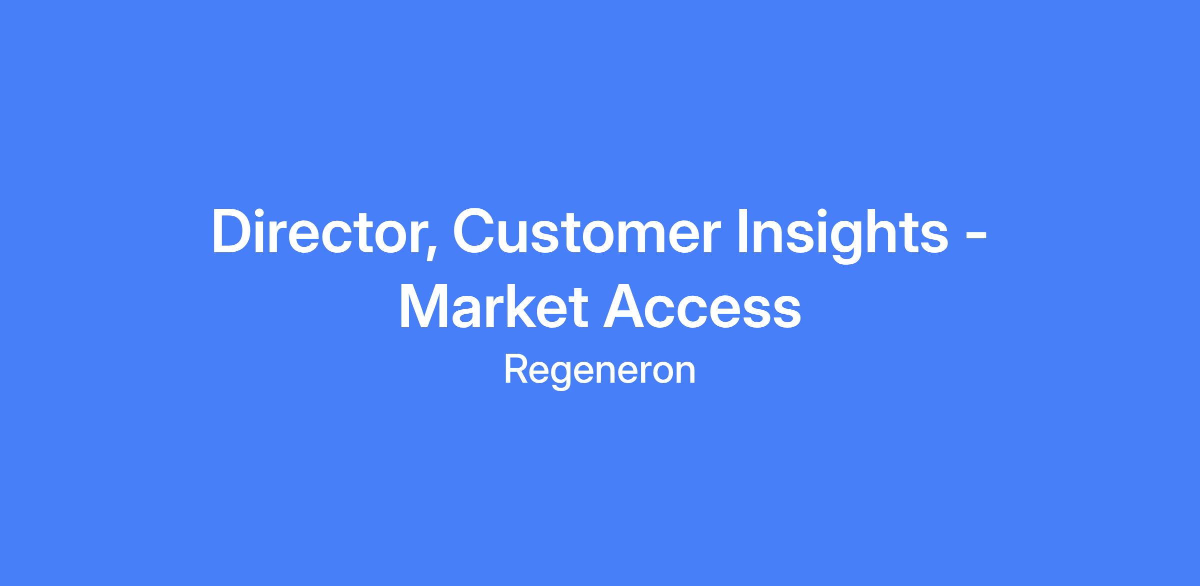 Director, Customer Insights - Market Access at Regeneron. This role partners with Market Access stakeholders to inform business decisions by understanding customer needs, behaviors and preferences, translating insights into actionable strategies that enhance market access, drive growth and improve customer experience across Regeneron brands. It requires applying market research methodologies to inform commercial market access strategy and implementation.