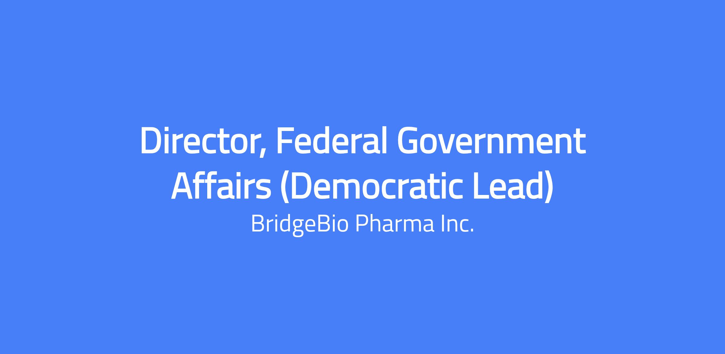 Reporting to the Executive Director, Government Affairs, the Director will help drive BridgeBio’s federal policy strategy and shape the company’s engagement across Congress, federal agencies, and key industry coalitions. You will serve as a principal representative and strategic lead of BridgeBio’s federal policy strategy, ensuring the company’s voice is clearly represented in the national debates shaping drug development, biomedical innovation, and patient access to life-changing therapies.Â