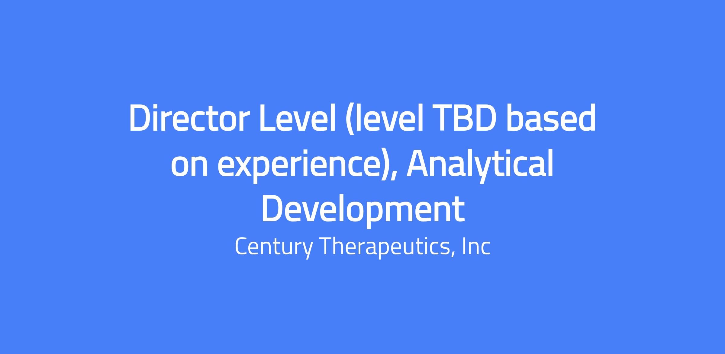 Role: Director level, Analytical Development (level TBD based on experience). Lead the analytical development team responsible for Century's quality control and characterization platform for iPSC-derived cell therapies. The role provides strategic and scientific guidance, oversees the selection of analytical technologies, establishment of analytical procedures, and the qualification/validation and transfer of methods in support of early development. The role collaborates with internal and external partners to advance pipeline programs through key CMC milestones. This position is based in Branchburg, NJ at the GMP manufacturing facility.
