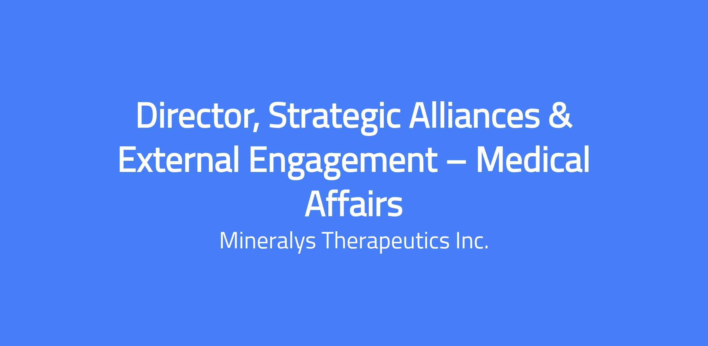 The Director of Strategic Alliances & External Engagement is a senior leader within Medical Affairs responsible for developing and executing a cross-functional coordinated engagement strategy that strengthens Mineralys’ scientific leadership in cardio-renal-metabolic disorders. This role drives collaboration across academic institutions, professional societies, patient advocacy organizations, and other key external stakeholders to support the full product lifecycle of lorundrostat, Mineralys’ first-in-class aldosterone synthase inhibitor.