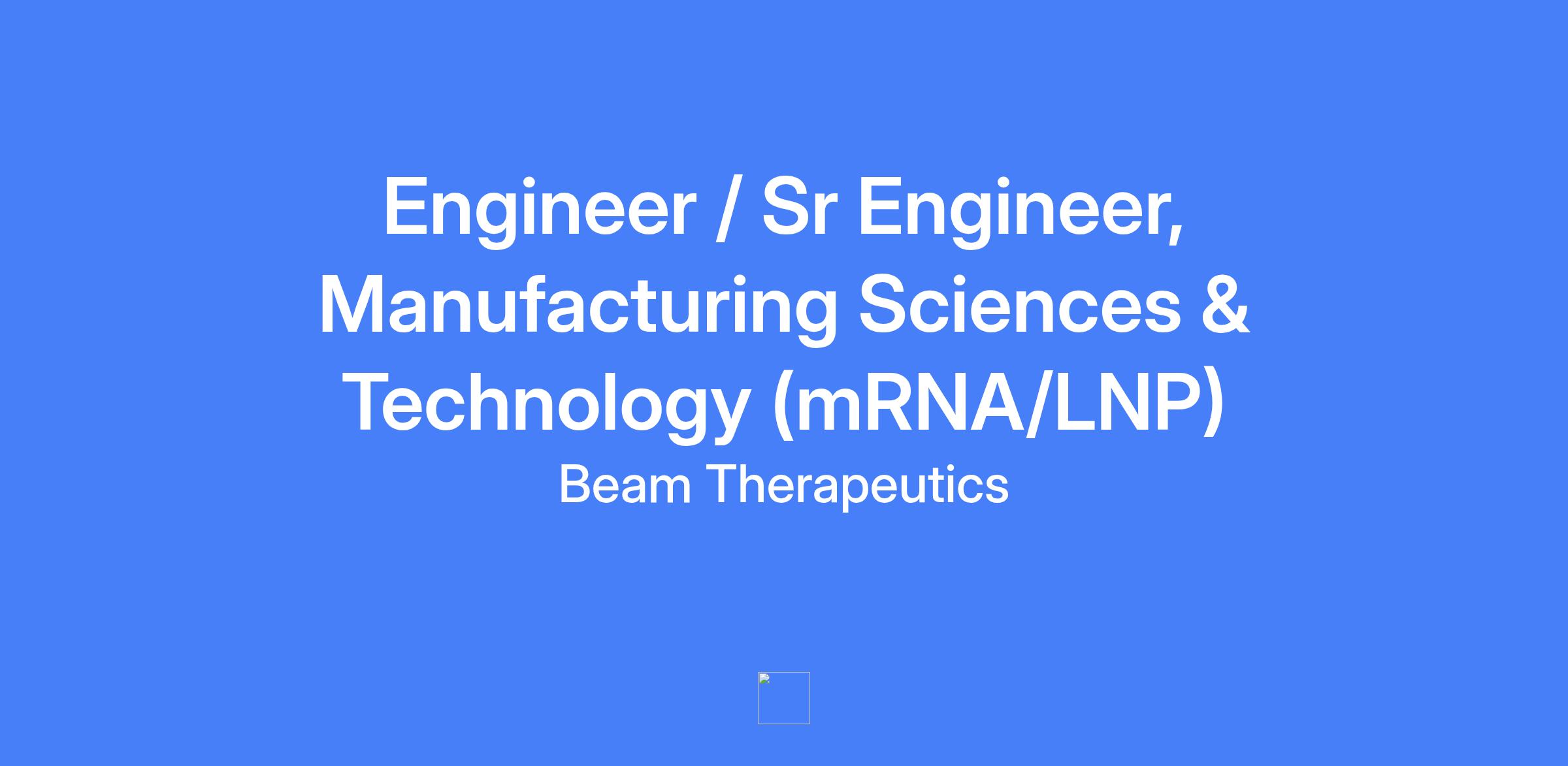 Engineer / Sr Engineer, Manufacturing Sciences & Technology (mRNA/LNP) supports MS&T activities related to mRNA and LNP programs, technology transfer, and GMP manufacturing processes. The role involves contributing to the full product lifecycle—from process design and PPQ to CPV and commercial production—through collaboration with cross-functional teams and on-site manufacturing operations. You will author technical documentation, support equipment design and GMP readiness, assist with regulatory submissions, and provide hands-on PIP support at Beam Durham, while fostering strong relationships across Beam sites and adapting to a flexible GMP manufacturing schedule.